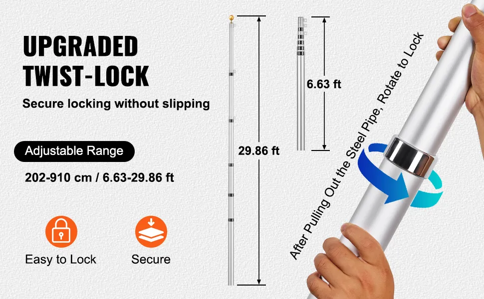 To ensure your flag pole kit stands firm in any weather, we've upgraded to a twist-lock structure. Simply pull out the steel tube and rotate to securely lock it in place, preventing sliding. Whether adjusting the height of the flagpole or keeping the flag steady, our design meets your needs.