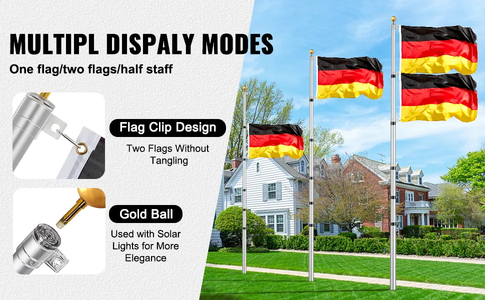 Our flag clip design of the flag pole allows you to hang one or two flags without worrying about them tangling. The top gold ball decoration not only adds aesthetic appeal but also complements solar lights (not included).