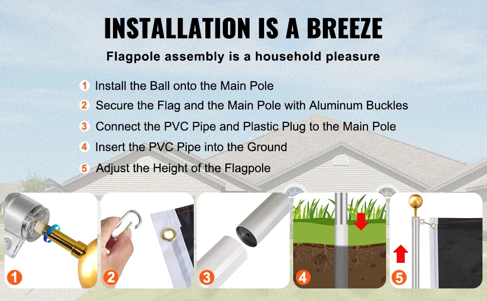 Our telescopic flagpole kit comes with detailed installation instructions, making assembly a breeze. From installing the gold ball on the main pole to securing the flag with aluminum clips and inserting PVC pipes into the ground, everything is straightforward, allowing you to enjoy the DIY process.