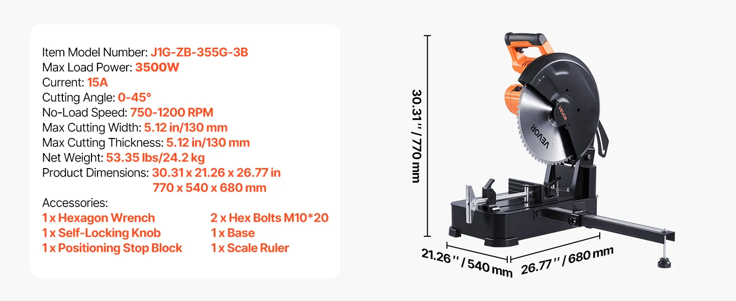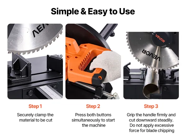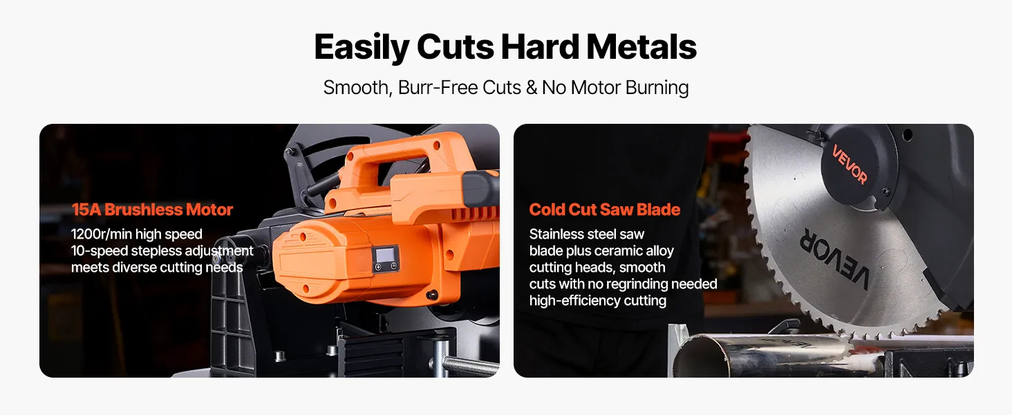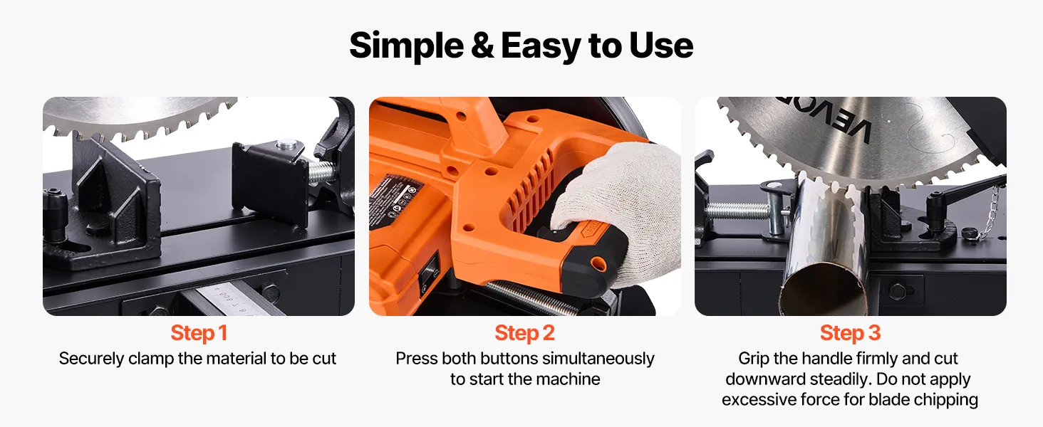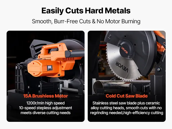 Our metal cutting chop saw features a high-speed motor and a cold-cut stainless steel blade with ceramic alloy cutting heads. It delivers smooth, burr-free cuts without regrinding, which works efficiently without overheating for long-lasting performance.