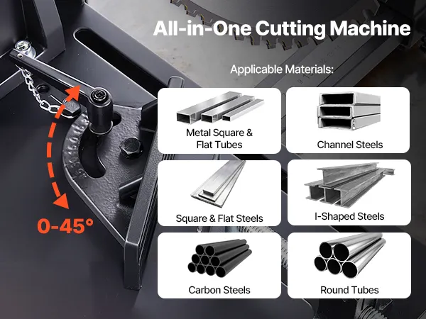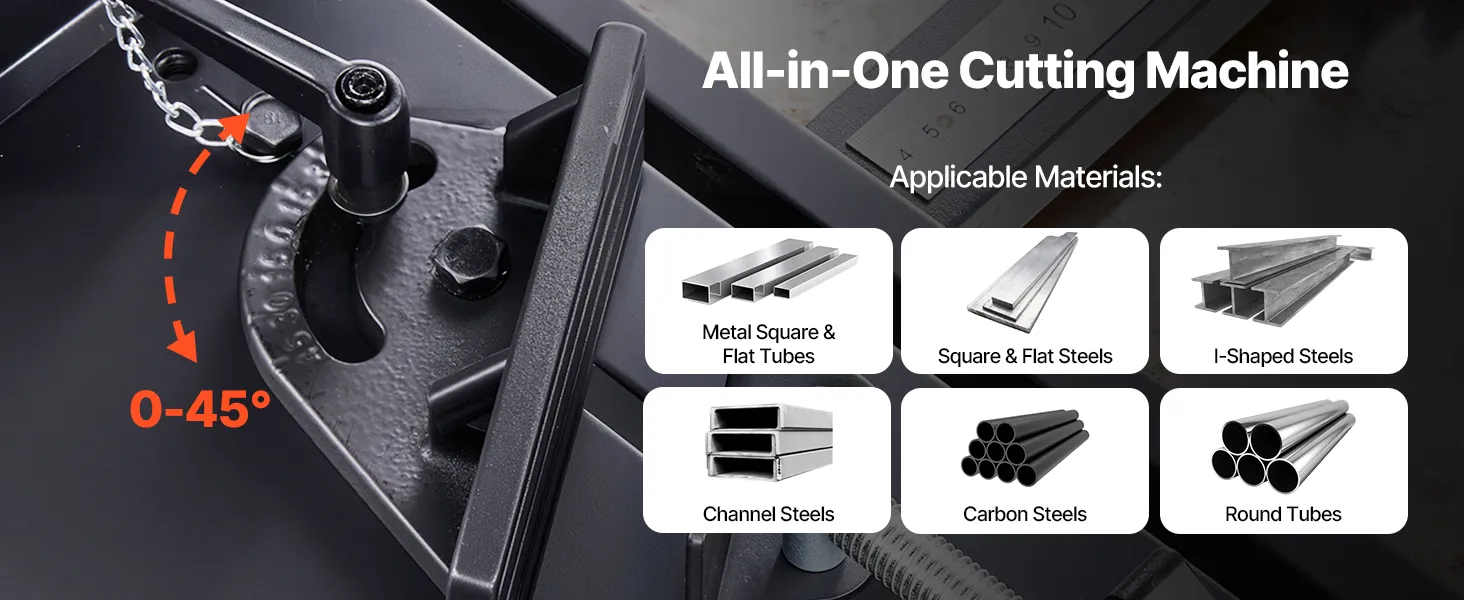 This metal chop saw supports 0–45° adjustable angle, which makes it ideal for cutting metal square & flat tubes, square & flat steels, I-shaped steels, channel steels, carbon steels, and round tubes. One machine handles all your metal cutting needs.