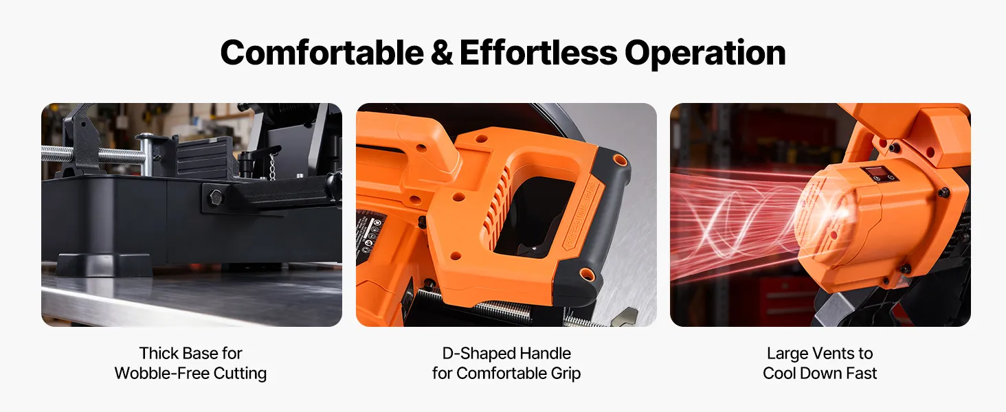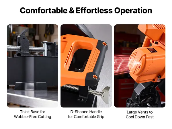 Our chop saw for metal cutting includes a thickened base for stable, wobble-free cutting. The D-shaped handle ensures a comfortable grip, and large vents provide quick heat dissipation. Thoughtful design keeps operation steady, comfortable, and secure, minimizing fatigue and risk.