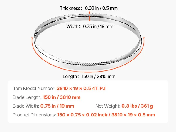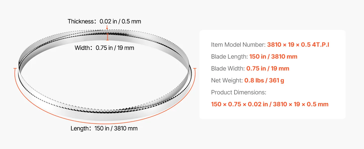VEVOR Bandsaw Blade, 3810 mm Length, 4 TPI Band Saw Blade with 18 HRC Hardened Sharp Teeth, SK5 High-Strength Carbon Steel, 19 mm Width, Replacement for Major Woodworking Band Saw Brands, 1 Pack
