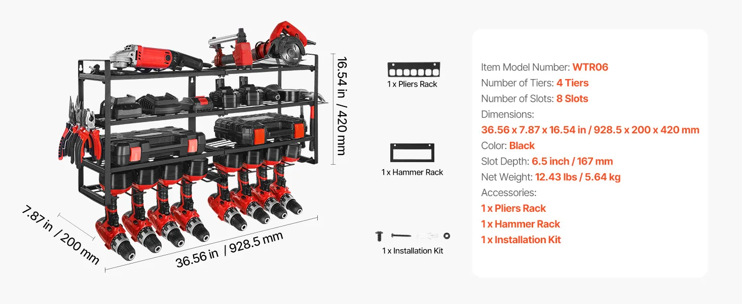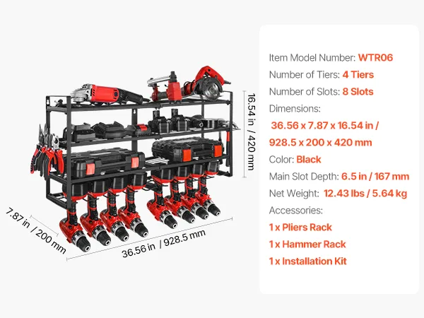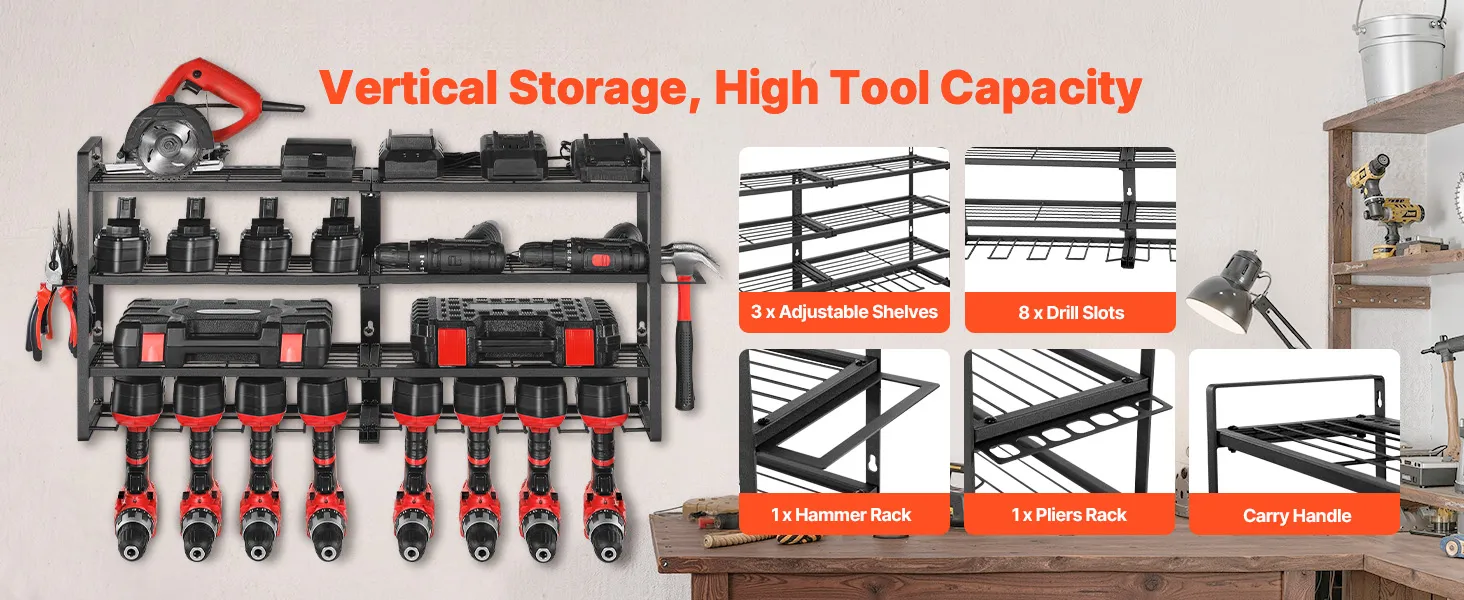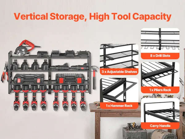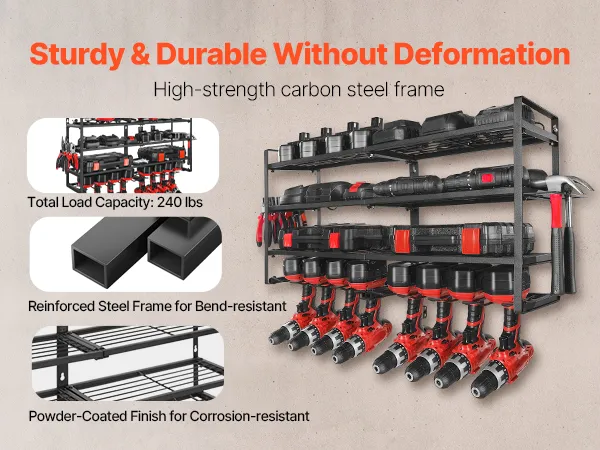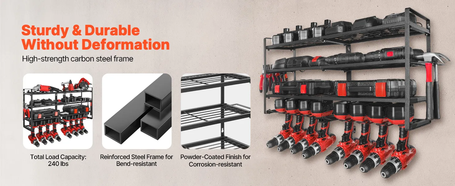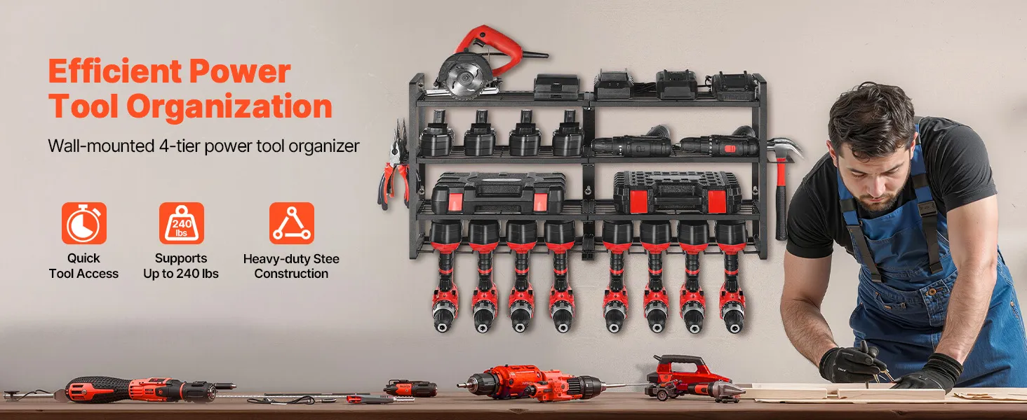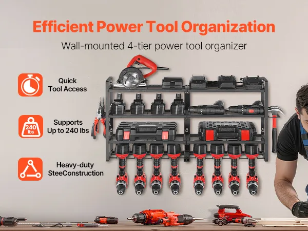 This wall-mounted 4-tier power tool organizer offers quick, grab-and-go access. Its sturdy carbon steel frame supports up to 240 lbs, making it easy to store drills, toolboxes, and more for a tidy, worry-free workspace.