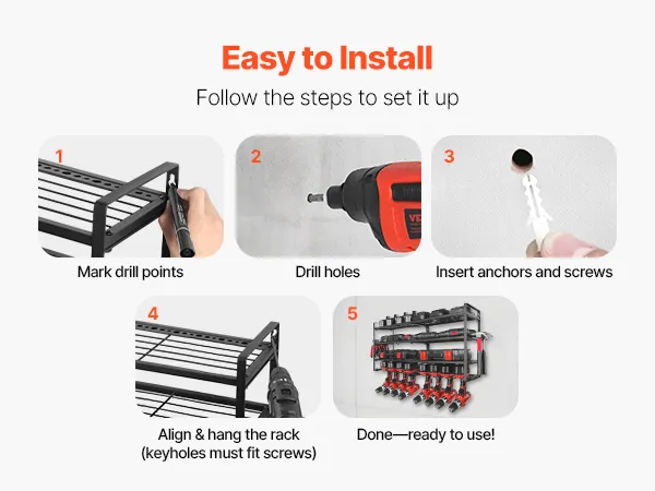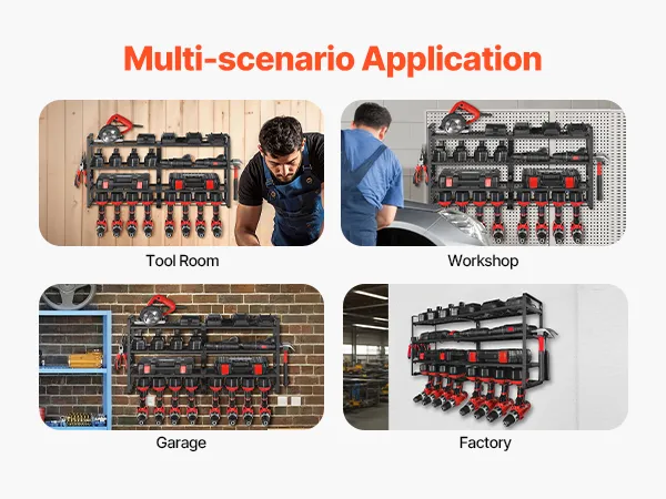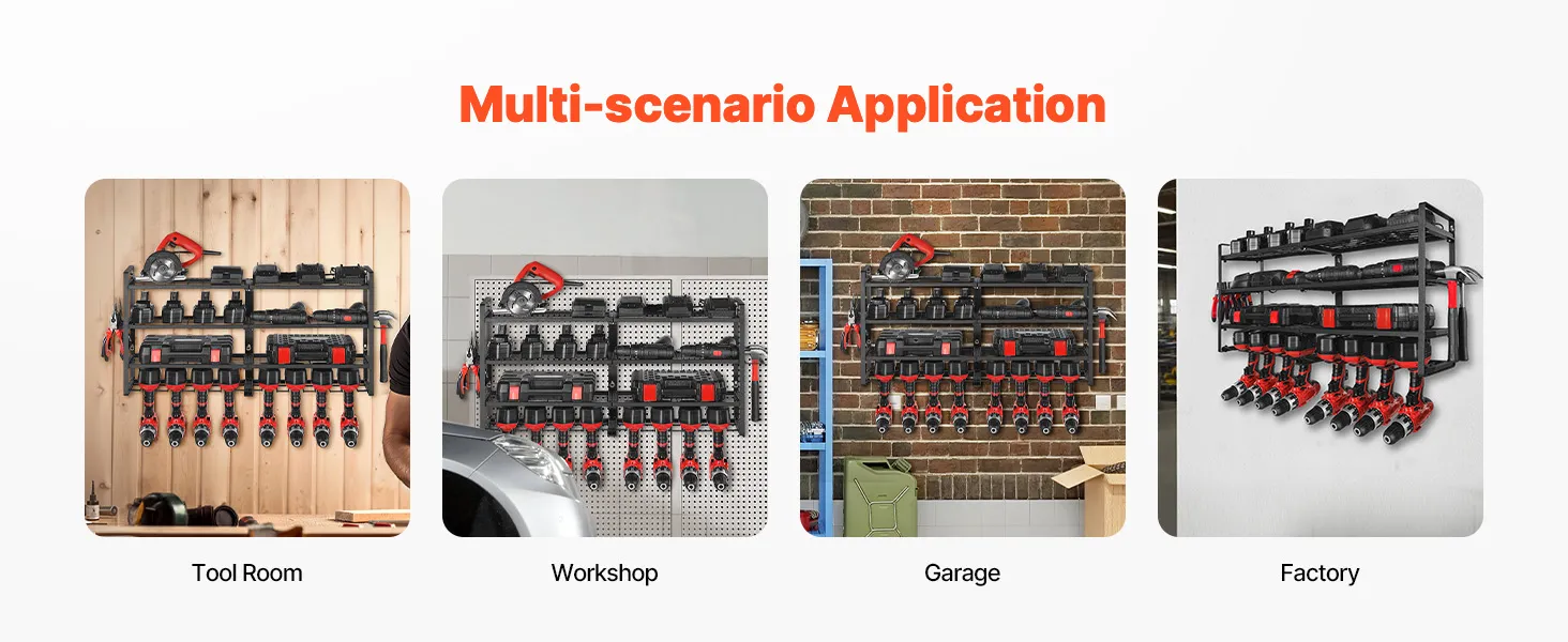 Built from high-strength carbon steel, this power tool storage rack resists bending or warping. The powder-coated finish boosts corrosion resistance, ensuring long-term durability and secure storage for all your tools.