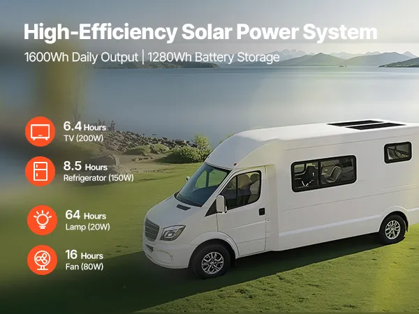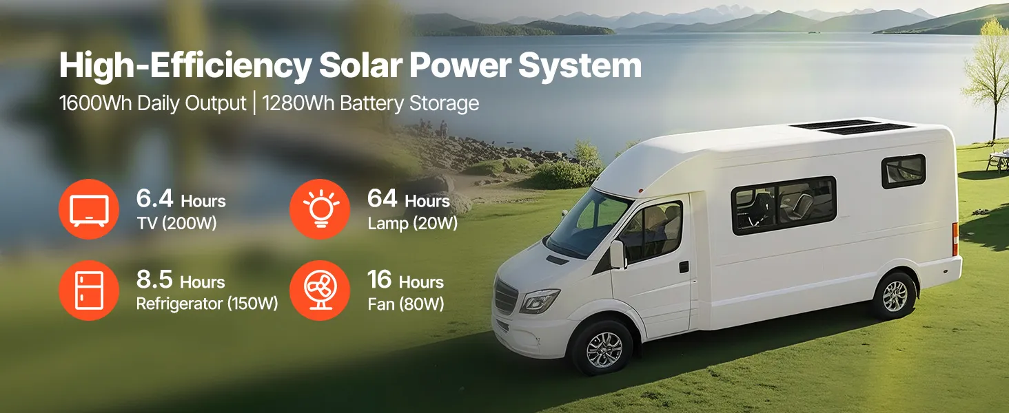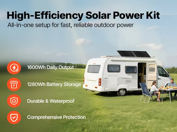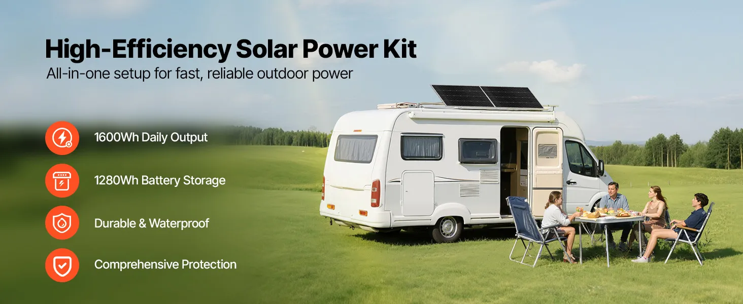 This solar power kit includes 2pcs 200W monocrystalline solar panels, a 12.8V 100Ah LiFePO₄ battery, a 40A MPPT solar charge controller, and a 12V 1000W power inverter. With up to 1600Wh/day output and 1280Wh battery storage, it provides reliable power for RVs, boats, homes, camping and more.