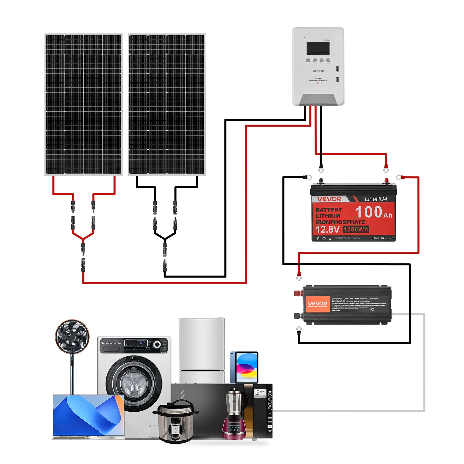 VEVOR 400W 12V Complete Solar Power Kit, 2PCS 200W Monocrystalline Solar Panels + 12.8V 100Ah LiFePO₄ Battery + 40A MPPT Charge Controller + 1000W Power Inverter for RV Home Camping Boats Off-Grid