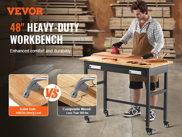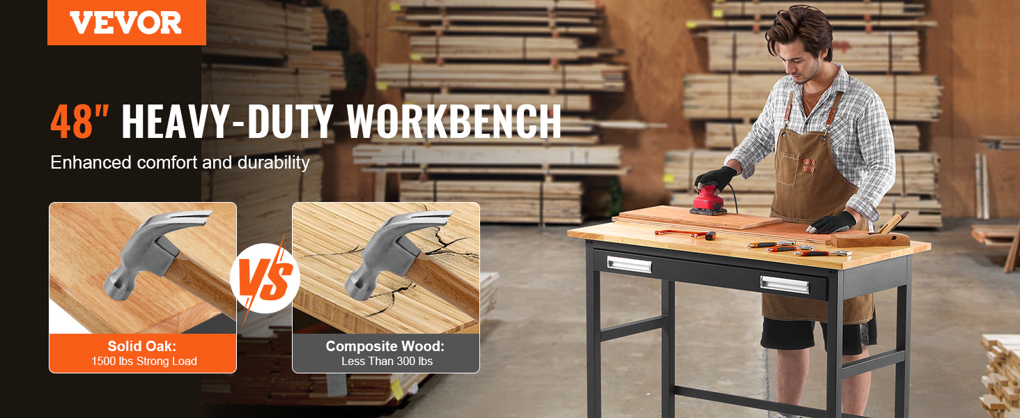 VEVOR 122 см Мобільний Верстак з Дубовою Стільницею, Шухлядою та Навантаженням до 680 кг для Гаража та Майстерні