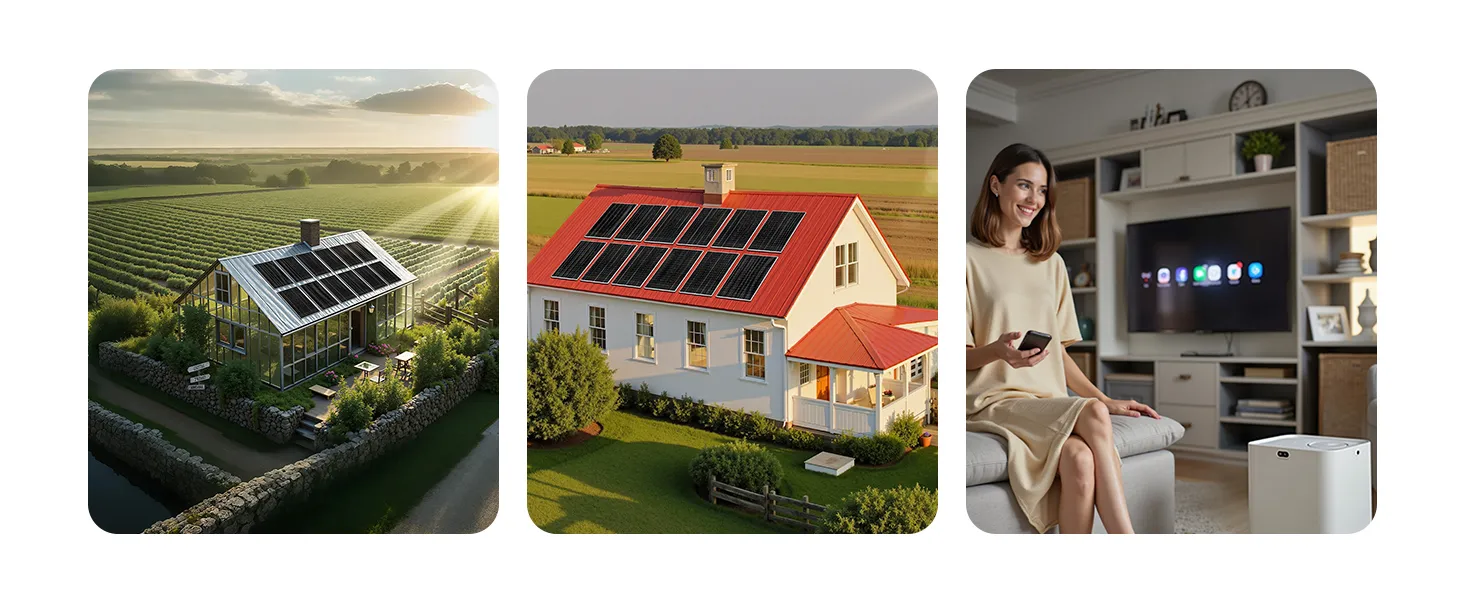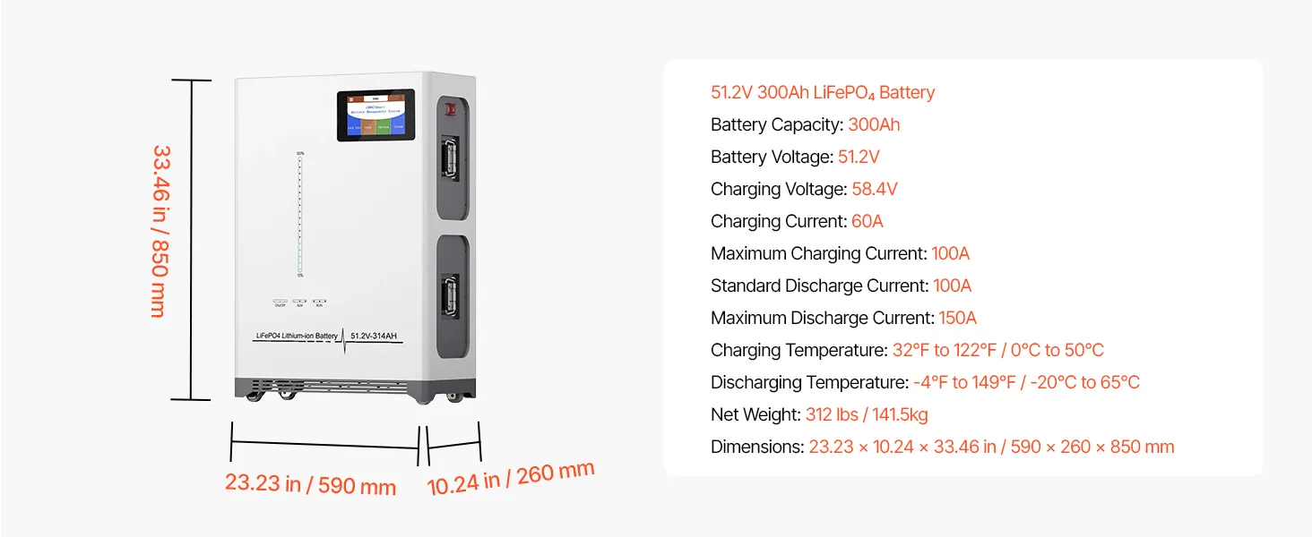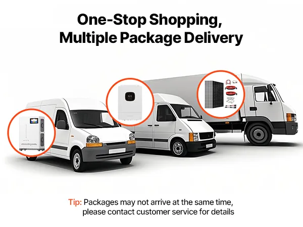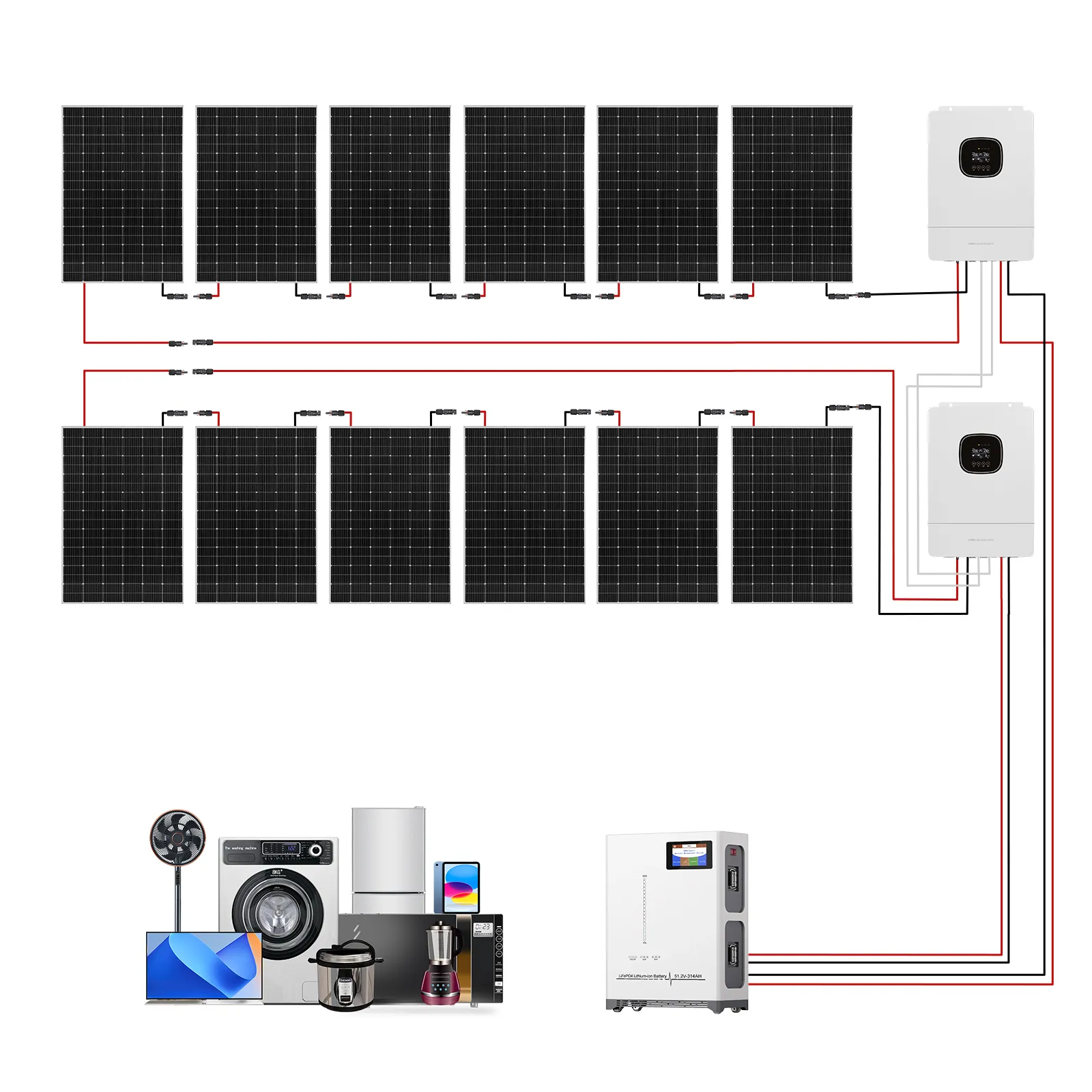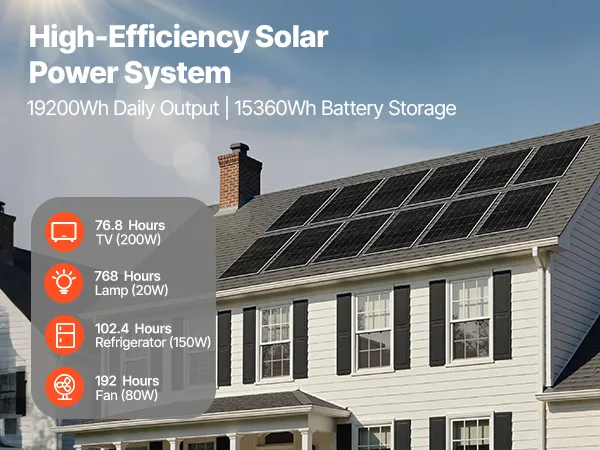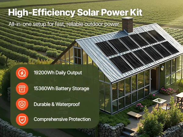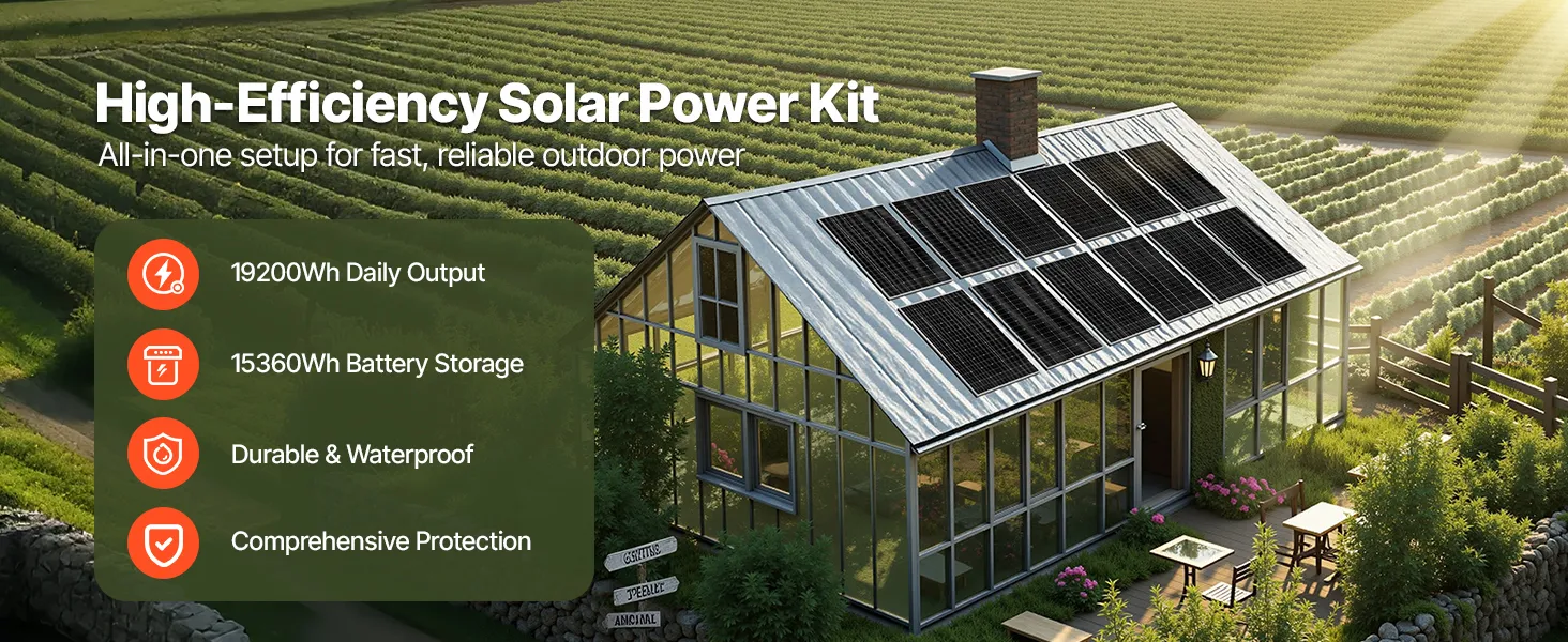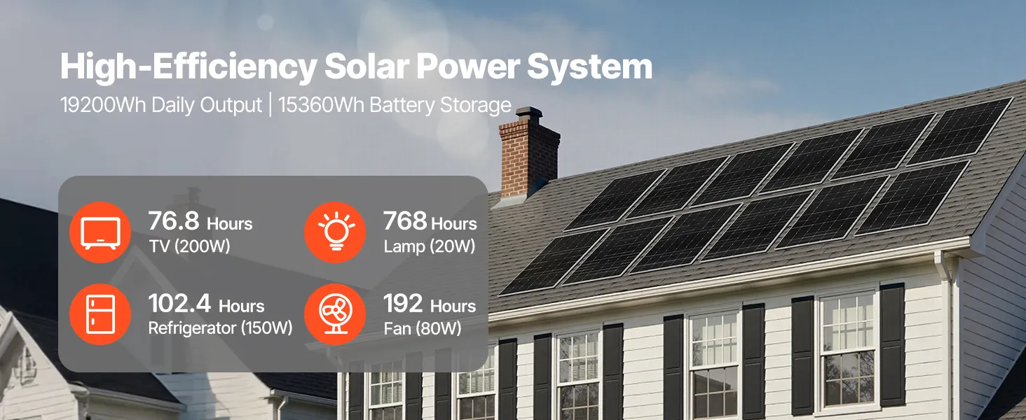 This solar power kit includes 12pcs 400W solar panels, a 51.2V 300Ah LiFePO₄ battery, and 2PCS 48V 5000W hybrid solar inverter. With up to 19200Wh/day output and 15360Wh battery storage, it delivers super high output to efficiently power large houses, sheds, farms, and high-demand appliances.