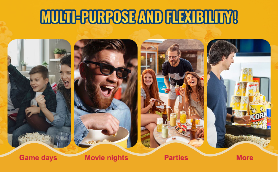 This popcorn maker machine is suitable for a variety of events, including birthday parties, gatherings, fundraisers, and sports events.