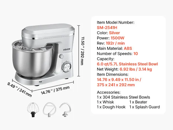 VEVOR 5.7L 1500W Stand Mixer with 10 Speeds, Stainless Steel Bowl, Dough Hook, Whisk & Beater for Baking – Silver