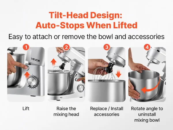 • Easy to Detach and Clean: One-touch tilt-head auto-stops when lifted, allowing easy attachment or removal of mixing tools. Twist and lift the bowl to detach. Accessories including the bowl, hook, and rod are made of food-grade stainless steel and are dishwasher-safe