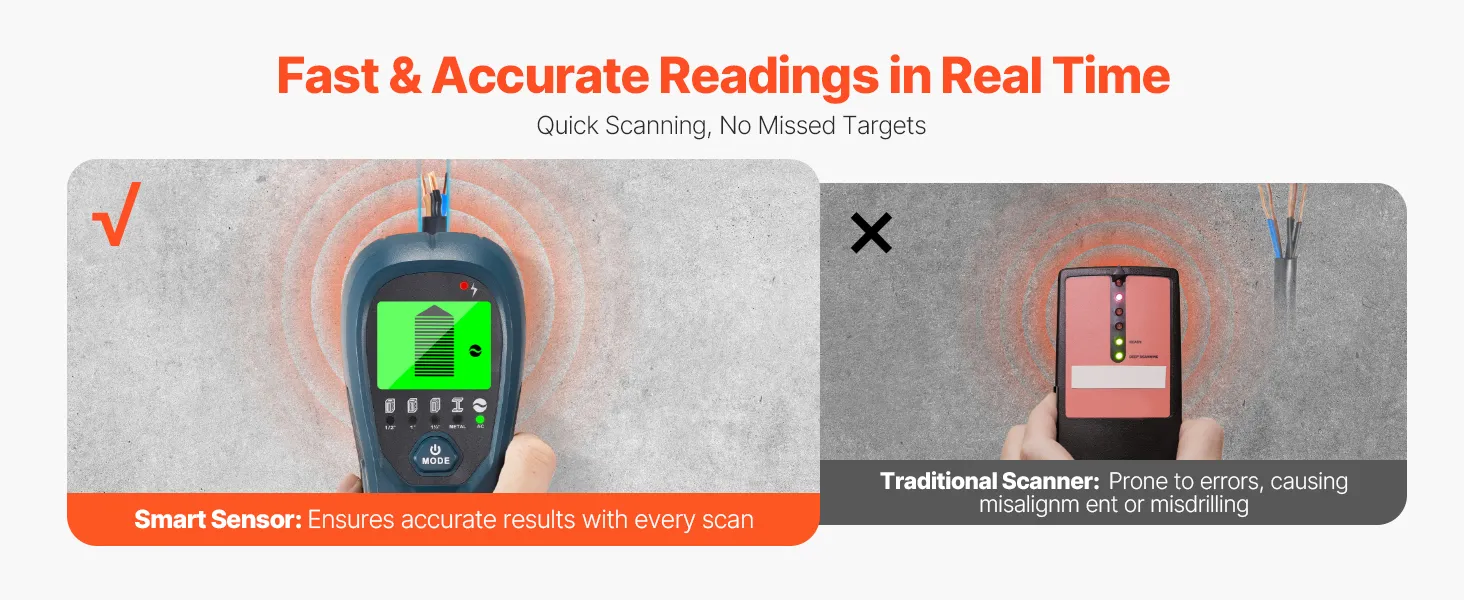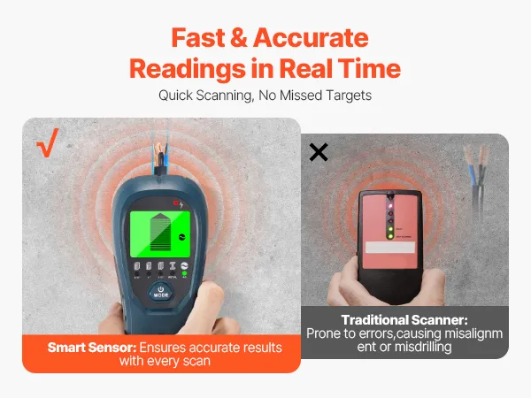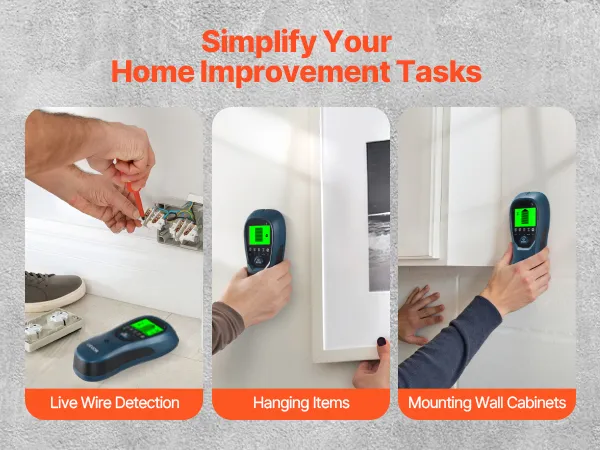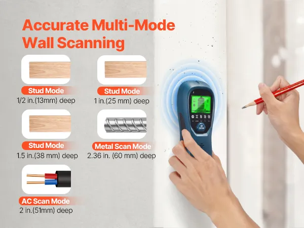 With 5 professional modes, this stud finder quickly detects hidden structures in various wall materials and depths. Easily switch between modes to scan for wood studs, metal, and wires, making it versatile for a wide range of home improvement tasks—saving time and increasing efficiency!