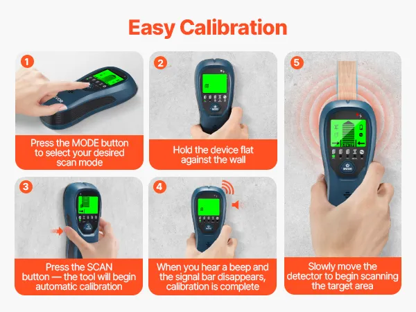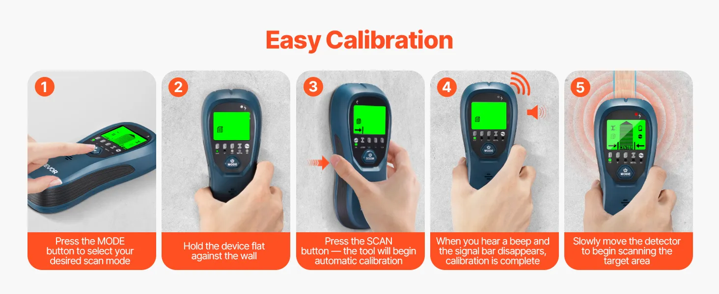 The wood stud finder features an intelligent calibration system. Simply press the MODE button after powering on, and it will calibrate automatically. Even first-time users can easily adapt, handling challenging environments like mixed materials or hollow walls with ease.