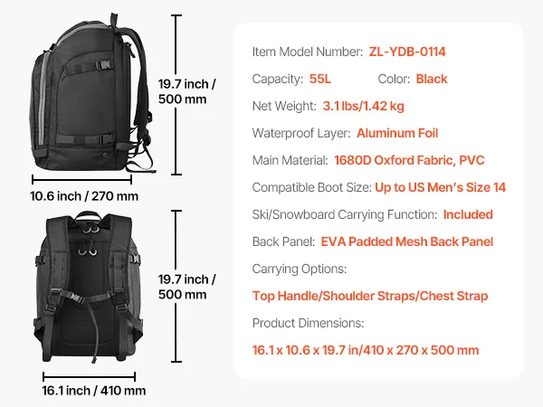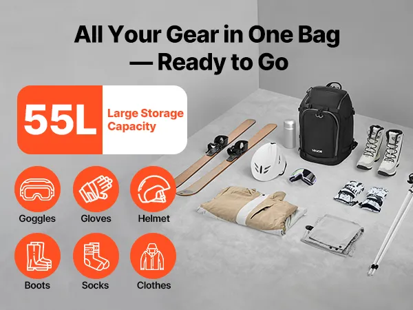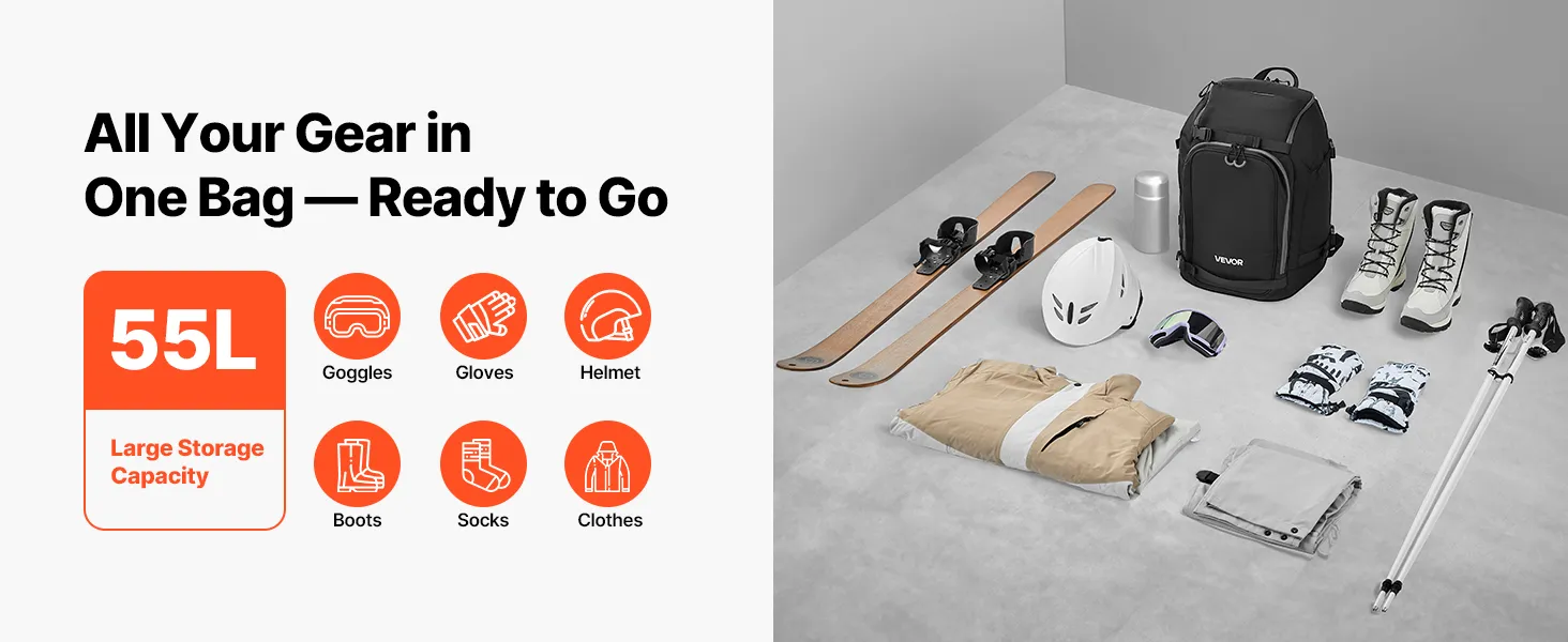 VEVOR Ski Boot Bag, 55L, Snowboard Boots Travel Backpack for Men Women, with Waterproof Exterior & Bottom, Durable 1680D Oxford, Bag for Skis, Snowboard, Helmet, Goggles, Gloves, Accessories (Black)