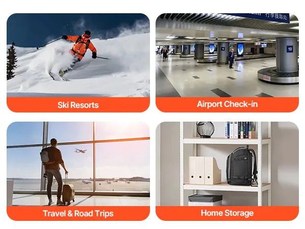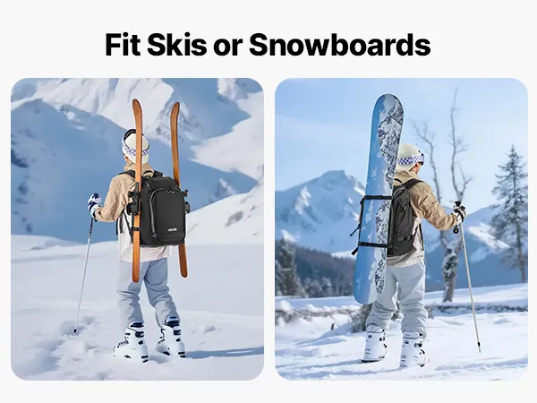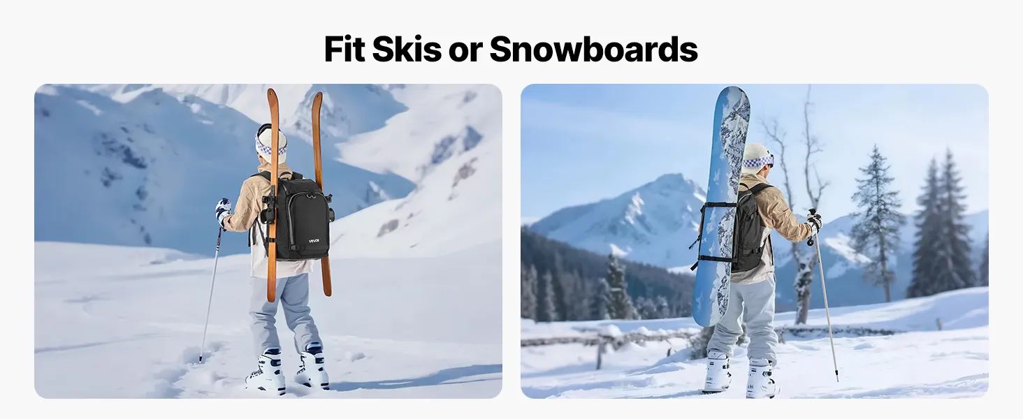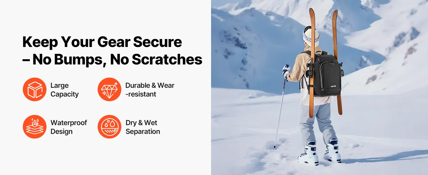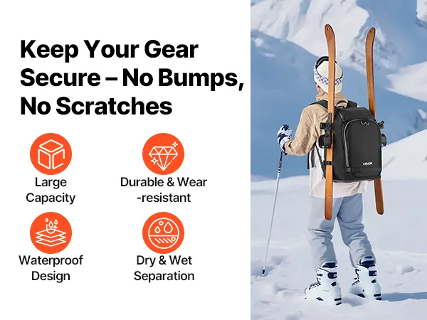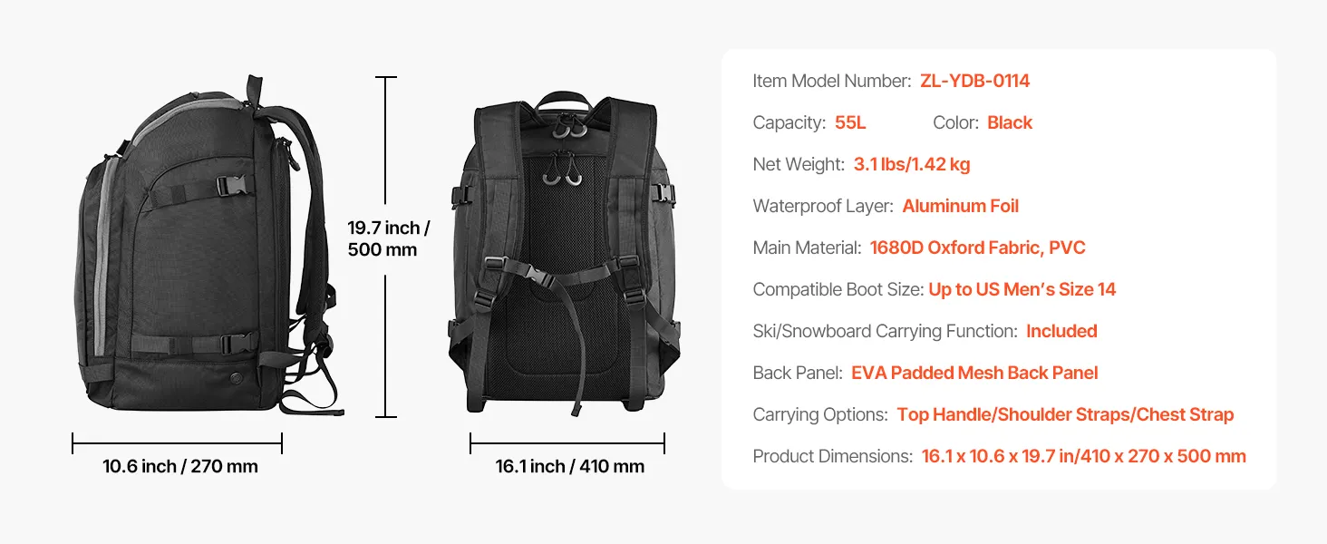 Our ski boot backpack fits snowboards and skis. Made of waterproof and wear-resistant Oxford fabric, with a standing mat and EVA-padded back panel, multiple compartments, it ensures organized storage and easy access. Fit boots and gear in one bag.