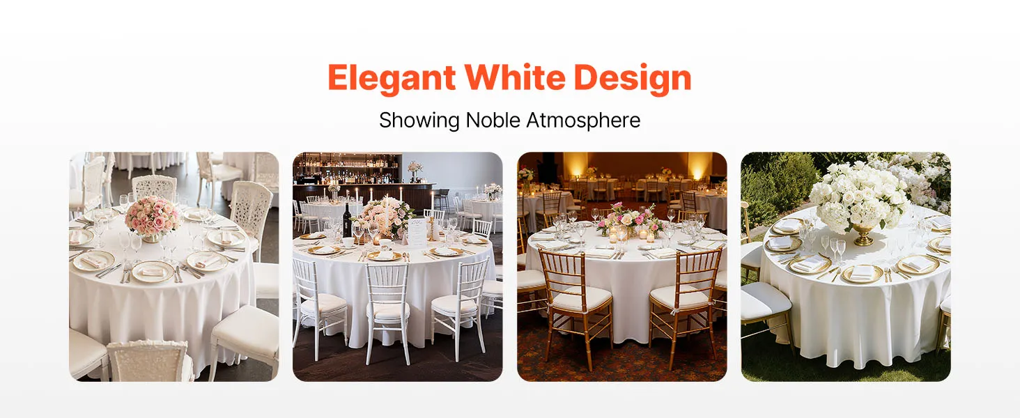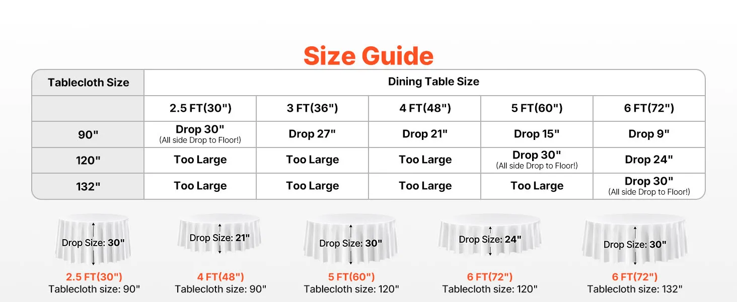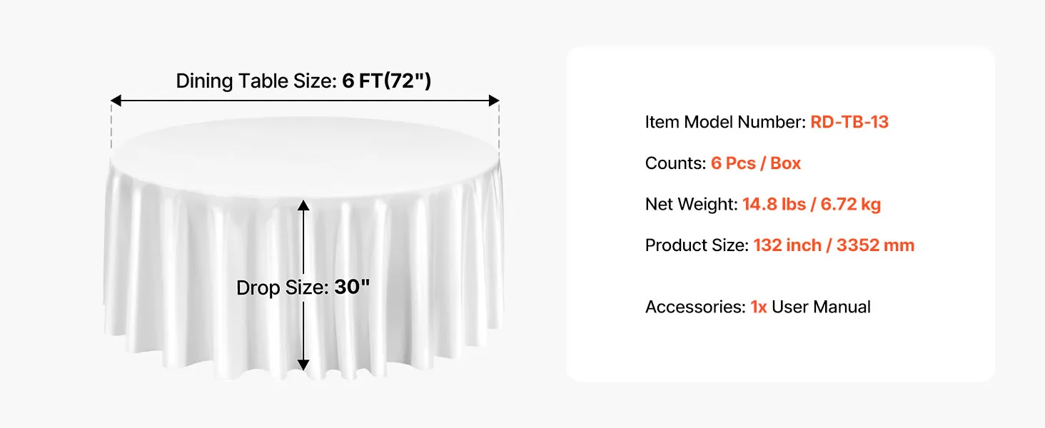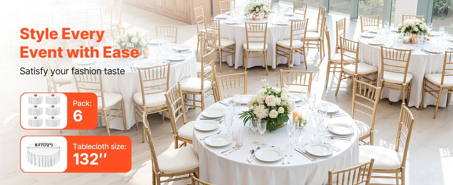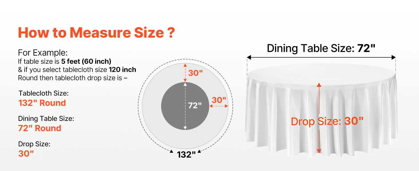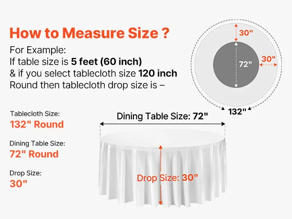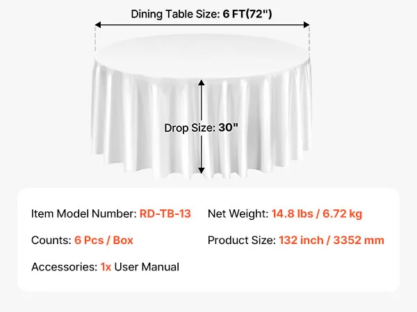 • Round Tablecloth Set: This round tablecloth helps protect against spills, stains, and scratches. The package includes 6 packs of white polyester round tablecloths, each 132 inches in diameter. Stylish and versatile. Please measure your table size before purchase and refer to our size chart for the best fit