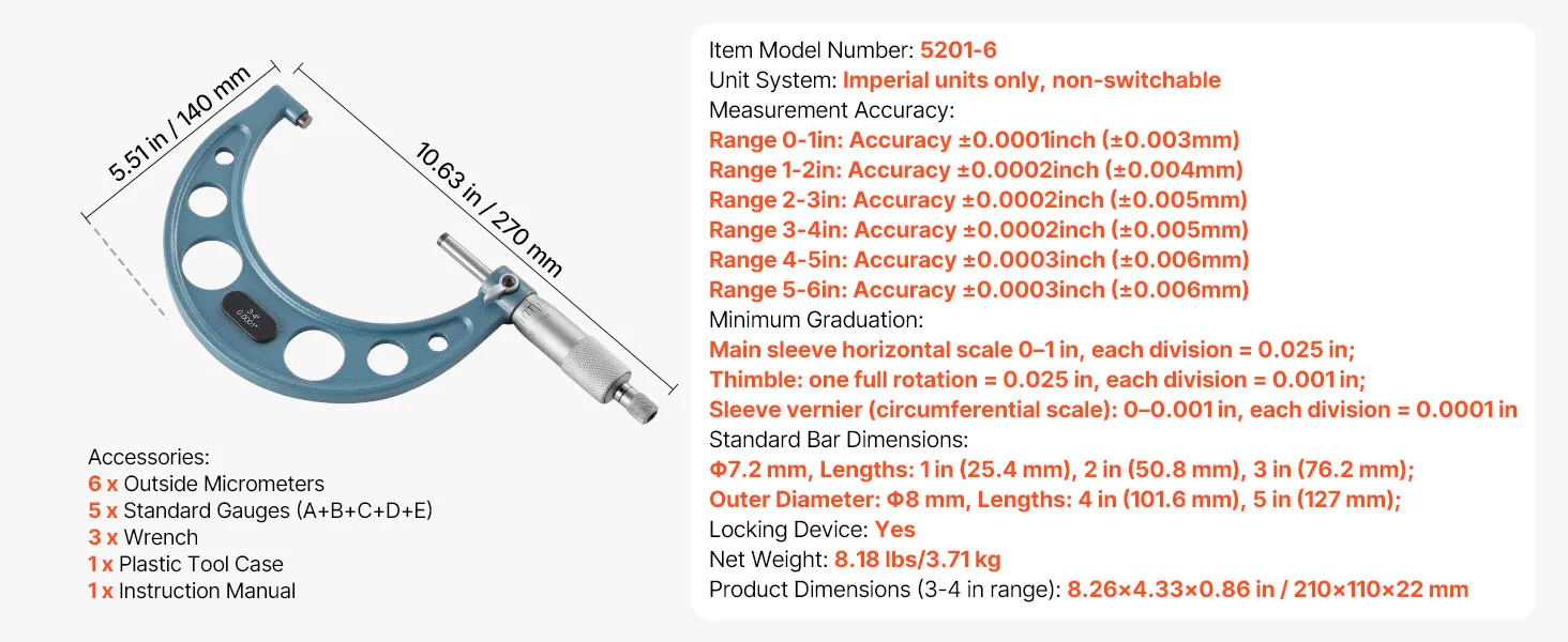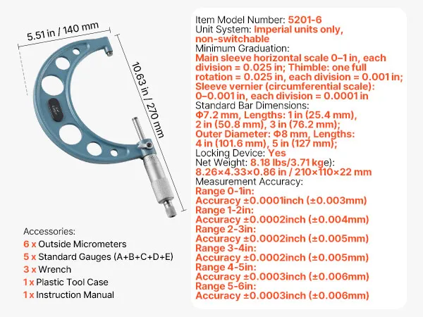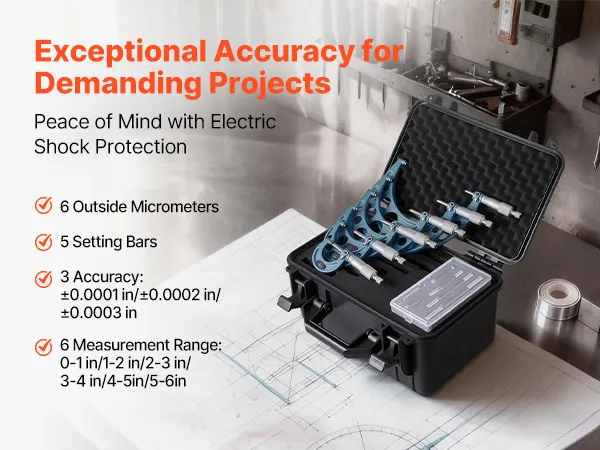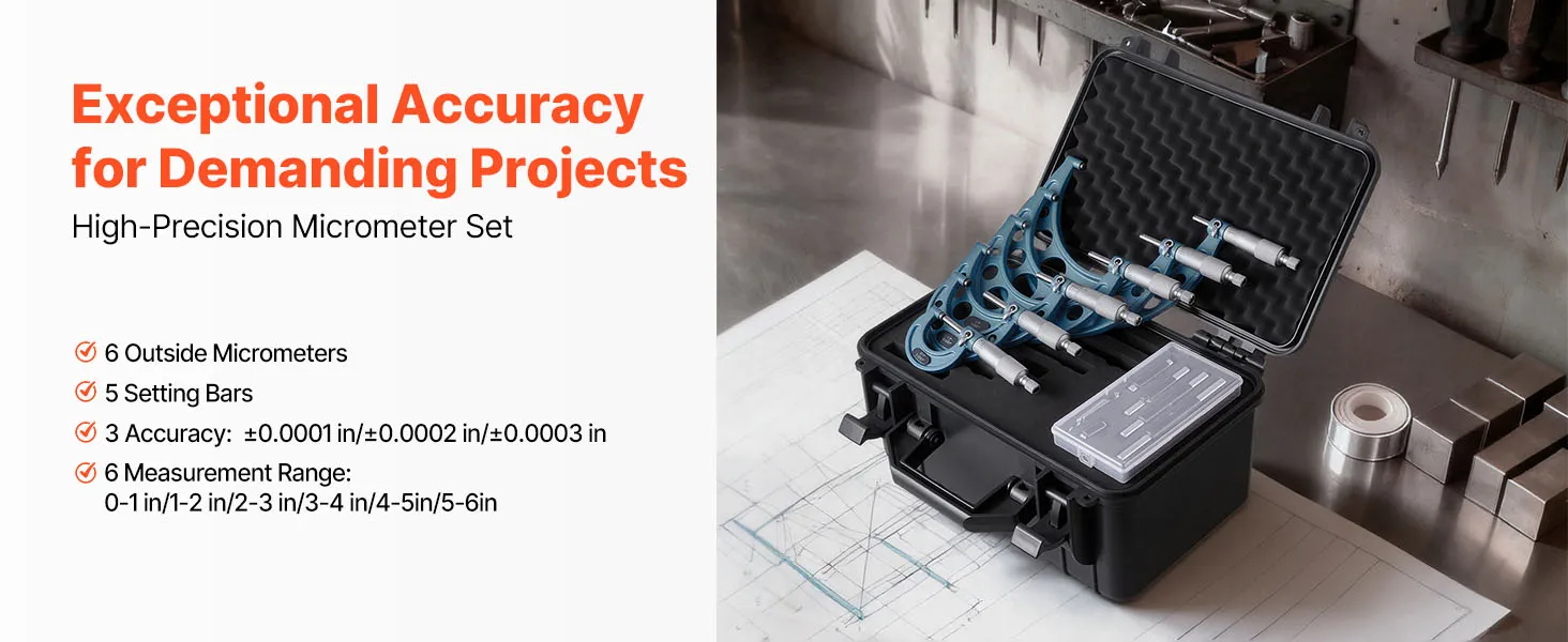 VEVOR 6 PCS Micrometer Set, 0-1/1-2/2-3/3-4/4-5/5-6/in Machinist Outside Micrometer, Precision Accuracy, Professional Machinist Tools with Protective Case, for Metalworking Engineering