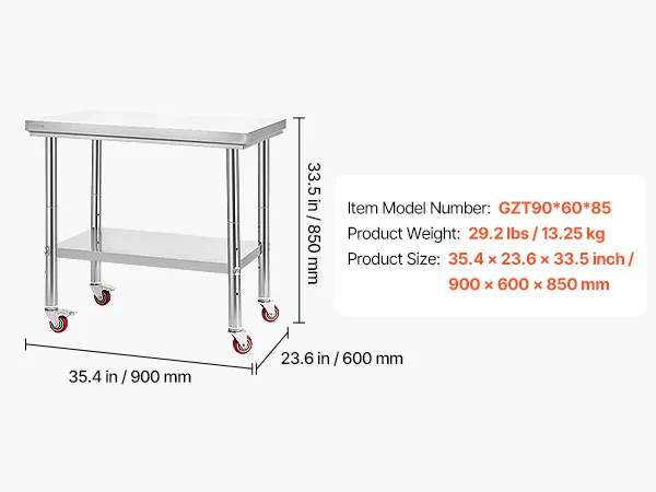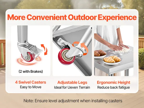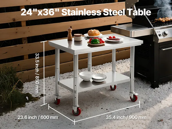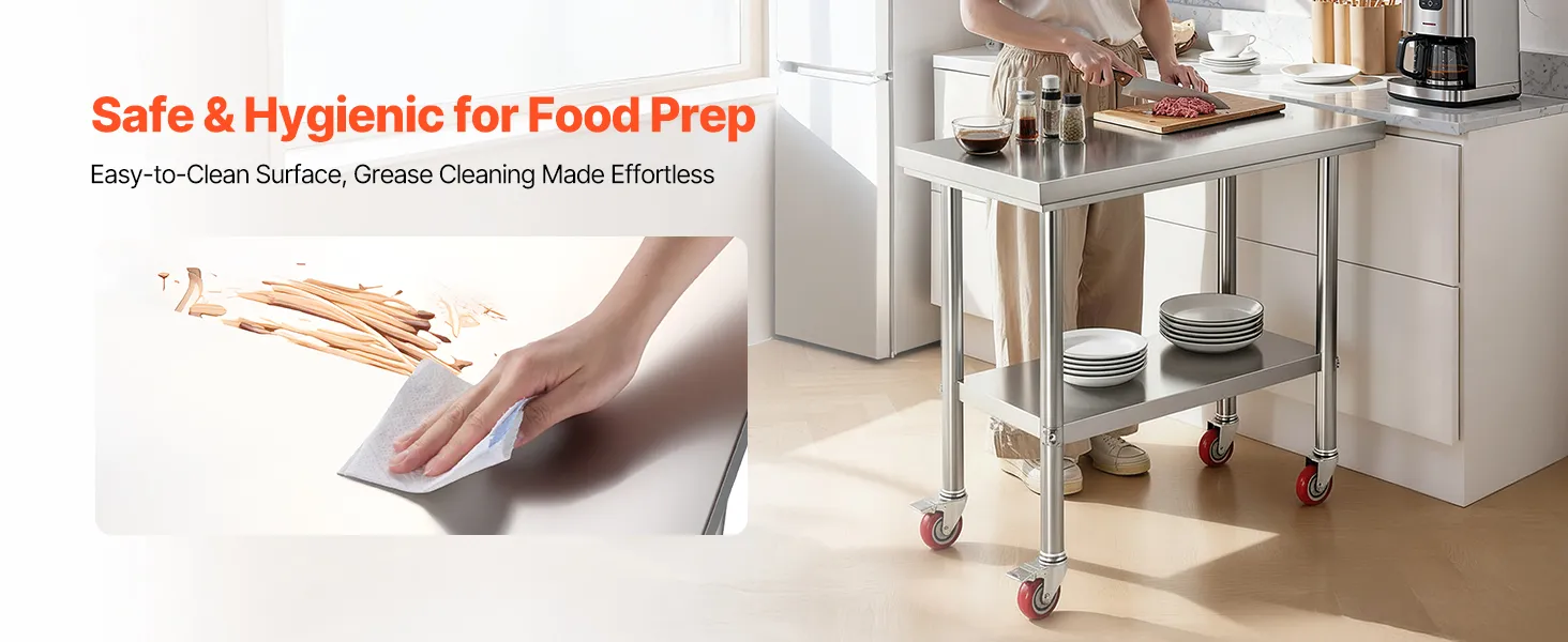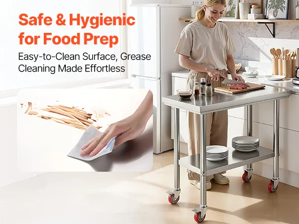 Our stainless steel table with wheels features high-quality stainless steel for a sturdy, durable build. It resists rust and water, and cleaning is a breeze with just a damp cloth.