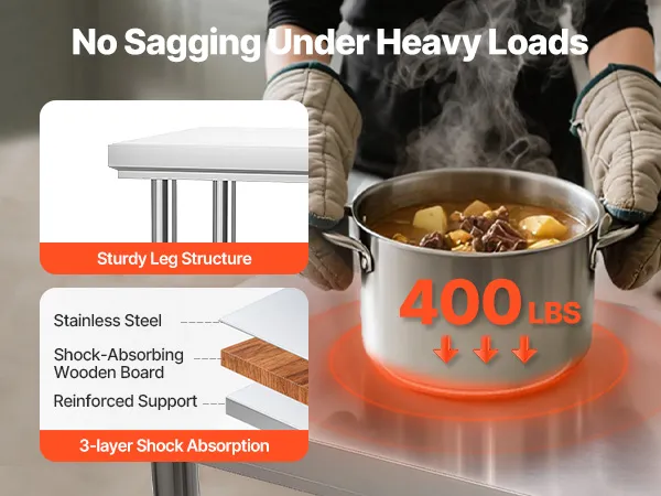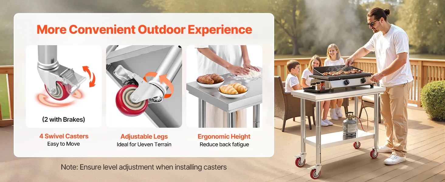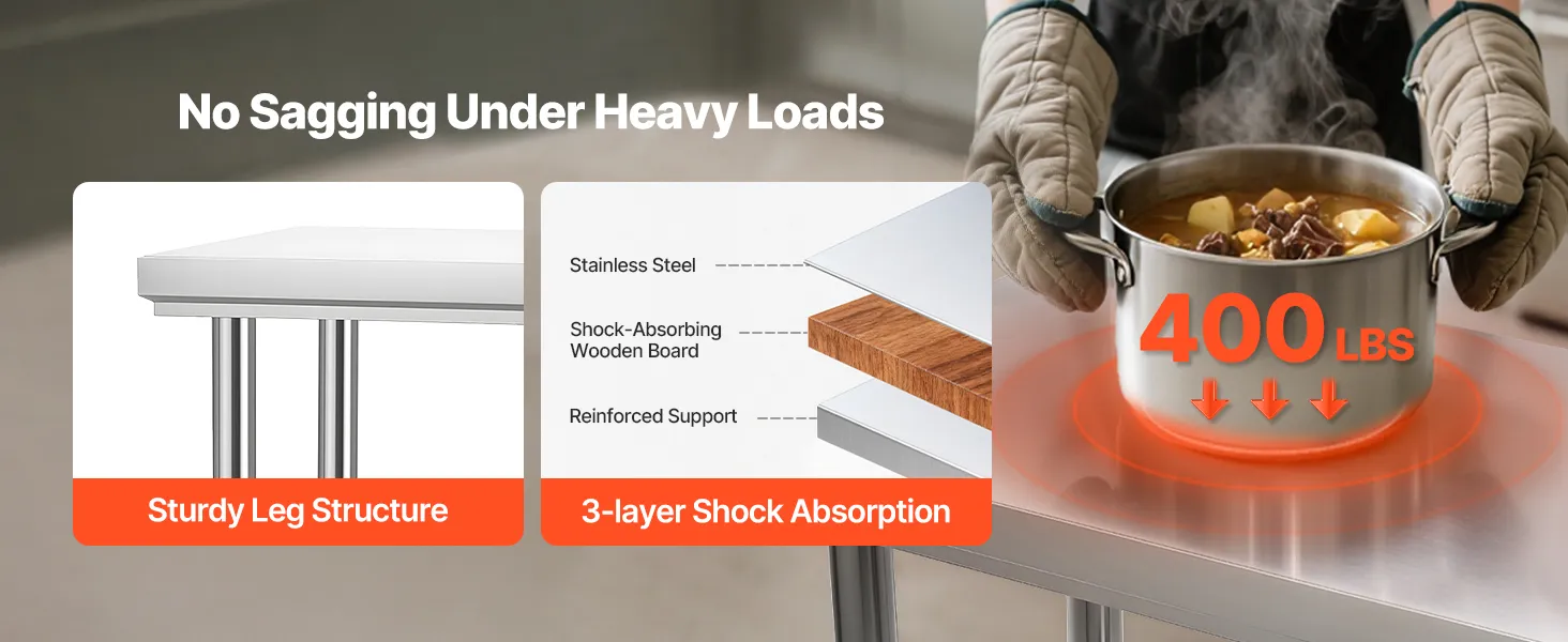 Made from SUS201 stainless steel for the tabletop, shelves, and legs, our food prep worktable boasts superior rust resistance and a more appealing finish compared to competitors using 430 stainless steel or galvanized materials.