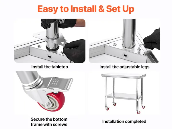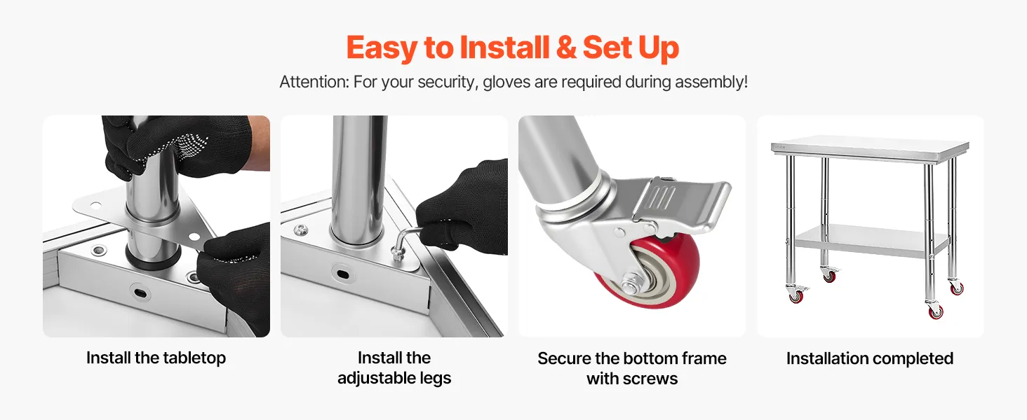 Adjustable shelf of the metal prep table offers the most user-friendly and practical features. Simply adjust the shelf height with screws to accommodate the size of the items you need to store.