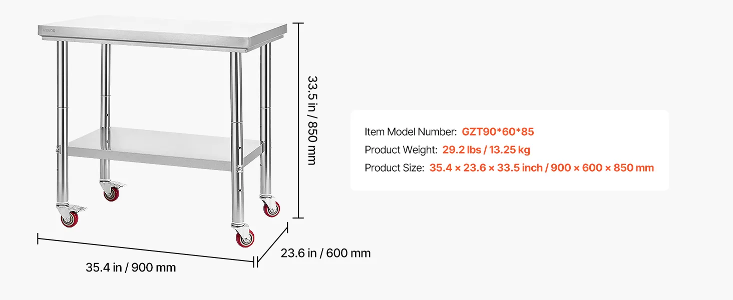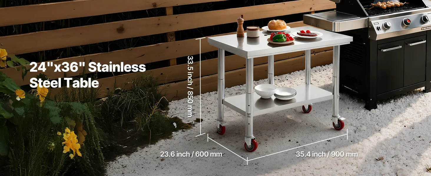 VEVOR Stainless Steel Table, 60 x 90 cm Food Prep Worktable with Wheels, Kitchen Prep Table with Adjustable Undershelf Workstations for Commercial Kitchen, Restaurant, Hotel and Garage, Outdoor