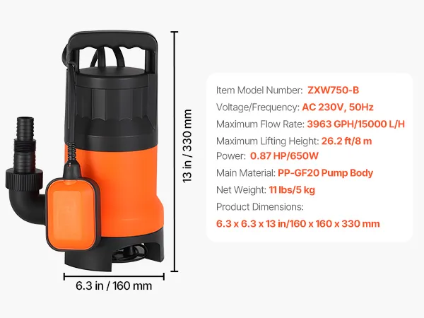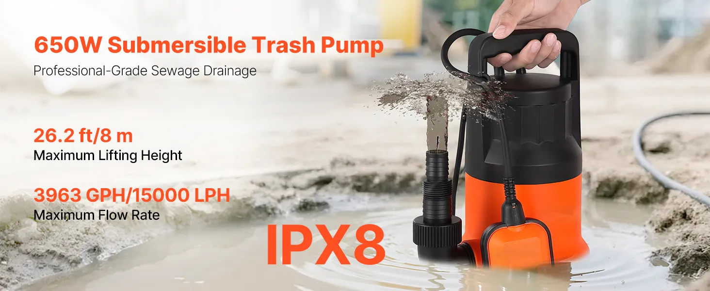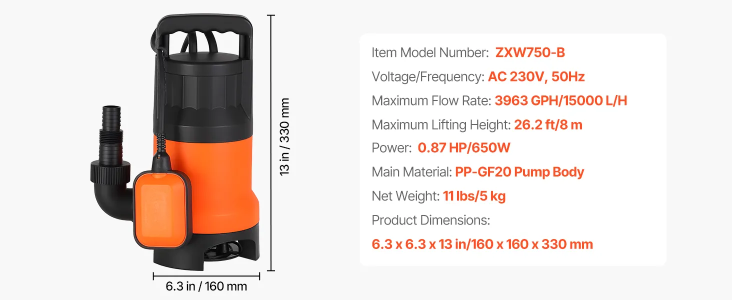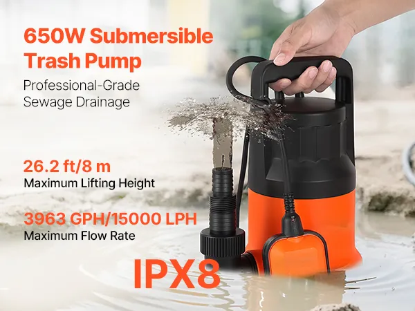 This 650W (0.87 HP) sewage pump delivers a 15,000 L/h (3963 GPH) max flow rate and an 8 m (26.2 ft) max head lift. With a corrosion-resistant plastic housing, an IPX8 waterproof rating, and a float switch, it ensures high submersible performance. Tackle demanding drainage jobs for pools, ponds, etc.