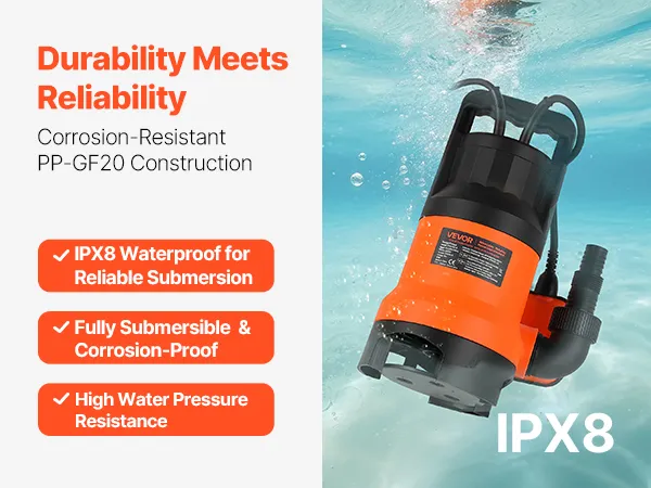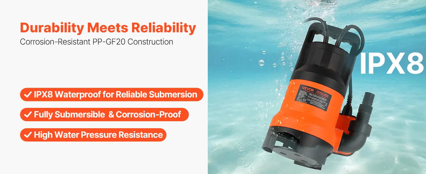 Crafted from corrosion-resistant PP-GF20 with IPX8 high-seal submersible performance for reliable operation underwater. This sewage sump pump is built to resist prolonged immersion, corrosion, and high water pressure for lasting durability.