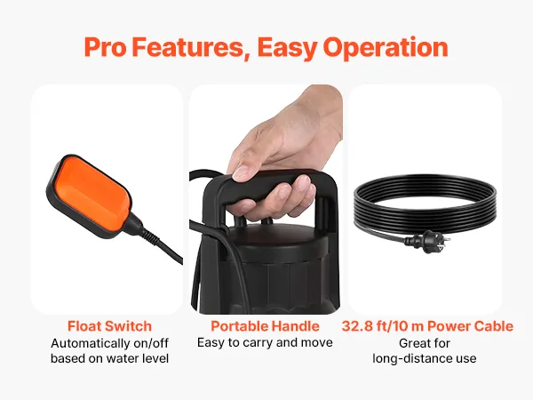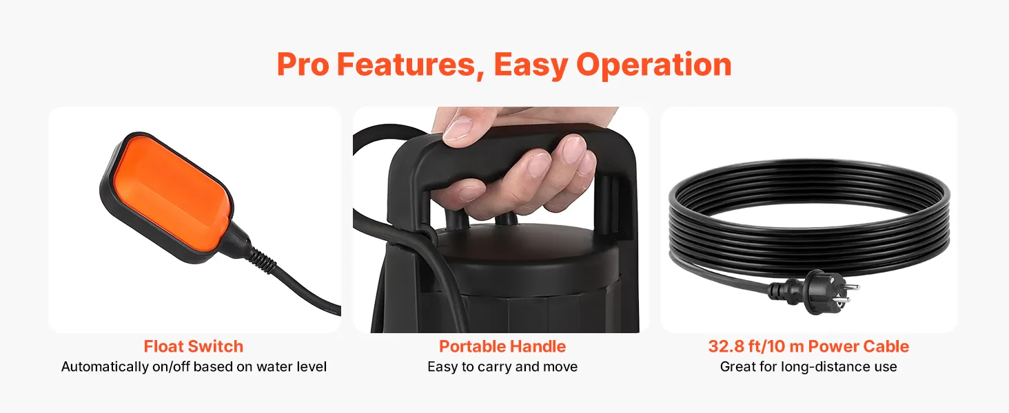 The float switch automatically turns on/off this submersible sludge pump based on water levels without constant monitoring. A portable handle makes transport effortless, while the long power cord provides flexible placement for hassle-free dirty water drainage.