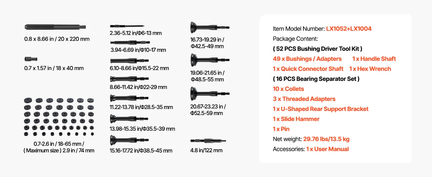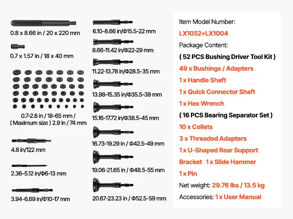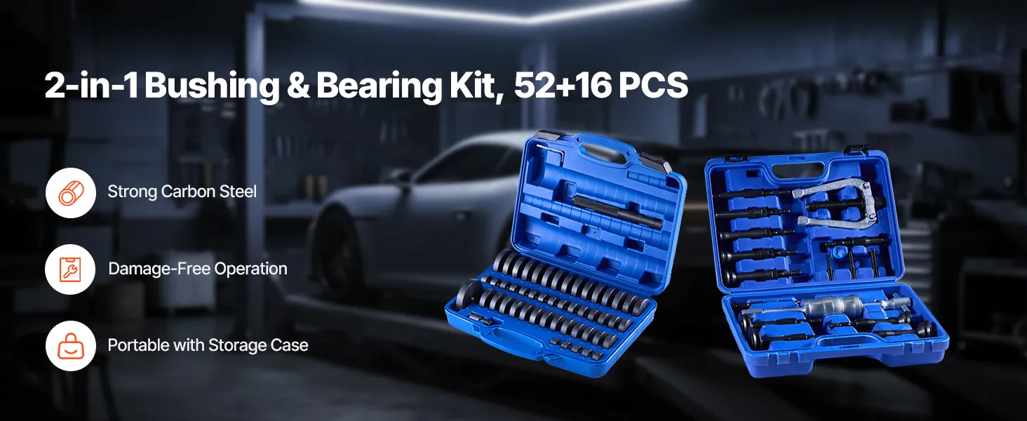 VEVOR Bearing Press Kit, 52+16 Pcs, 2 in 1 Bushing Driver Tool & Bearing Press Kit, Race and Seal Driver Set with 49 Bushings, 10 Collets, Slide Hammer, Heavy Duty Removal Installation Set with Case