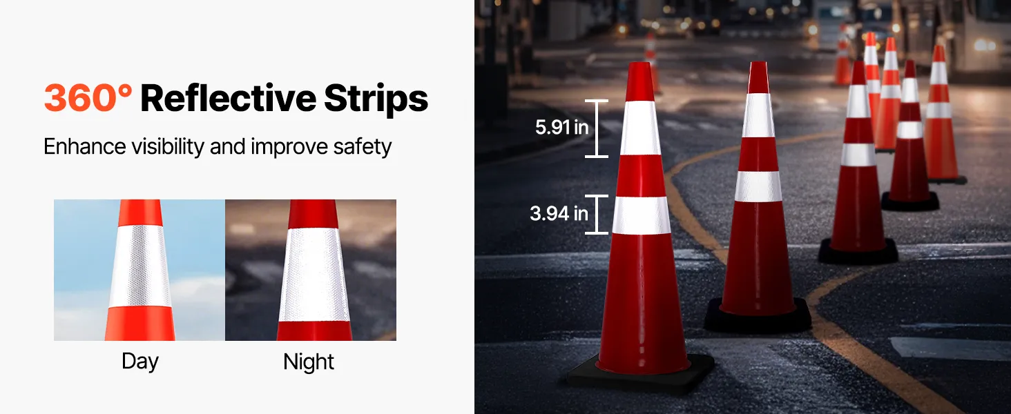 • High-Visibility Cones: Our fluorescent orange traffic cones feature high visibility, which makes them visible from any angle at distance as far as 800 feet. Moreover, two 6″ x 4″ silver reflective collars make the traffic cones noticeable, so people can be warned no matter if it’s day or night, sunny or rainy.