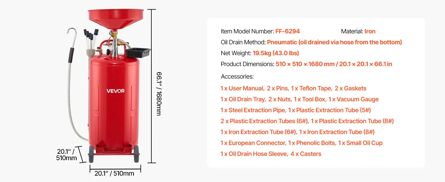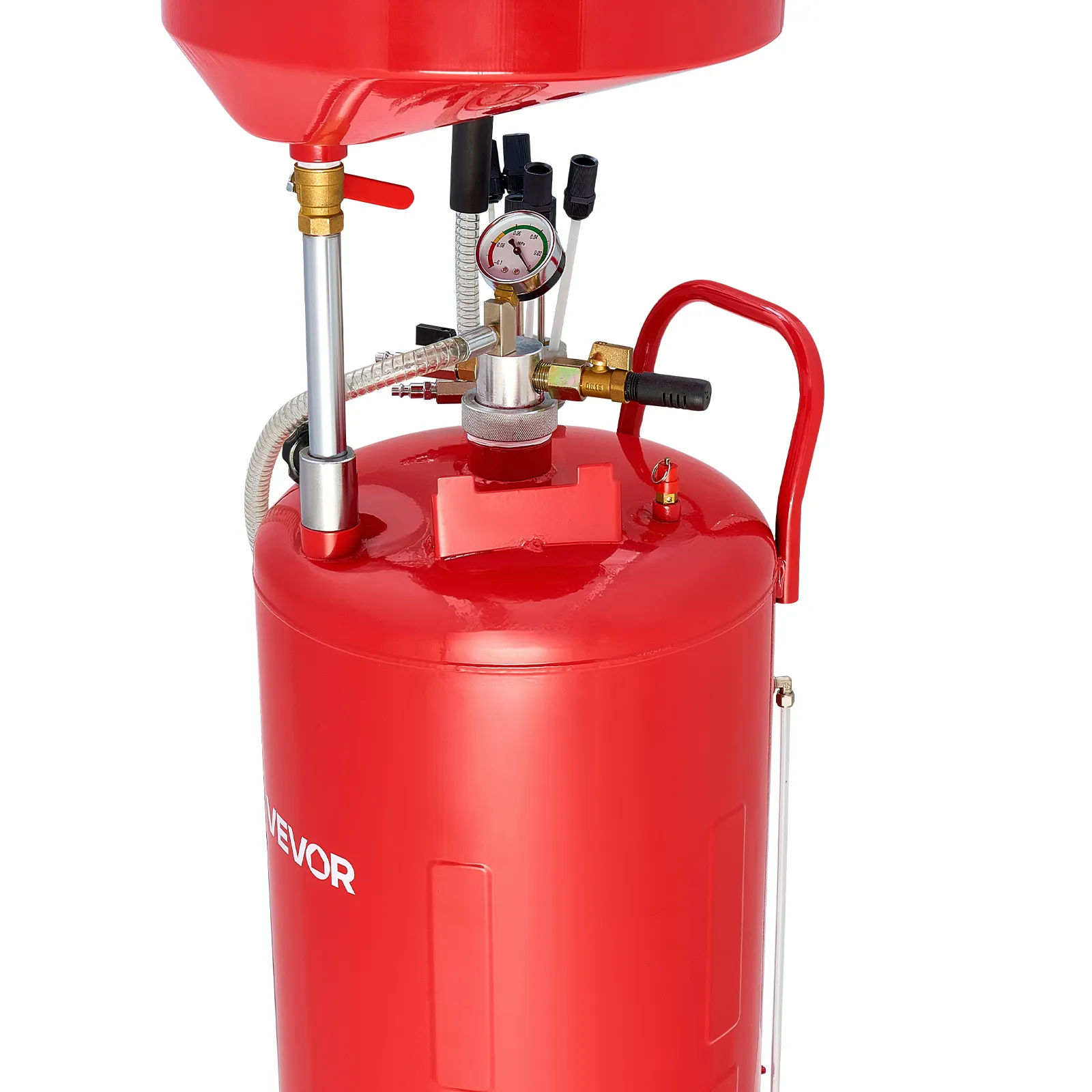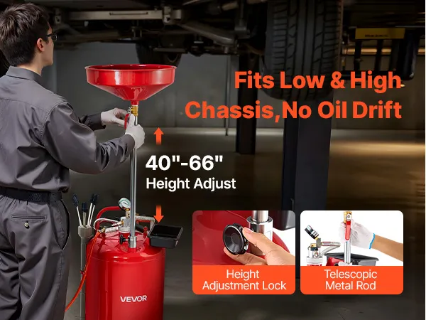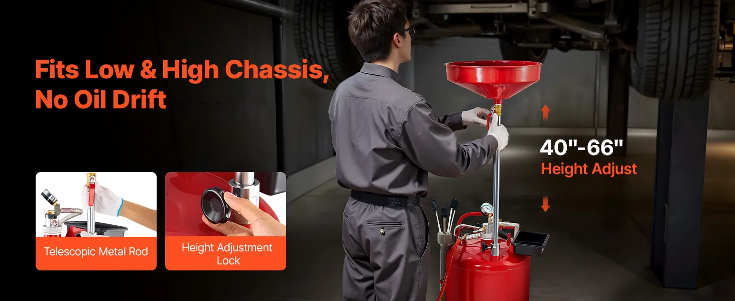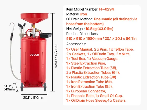 VEVOR 79.5L Waste Oil Drain Tank, Air Operated Portable Oil Drainer with Adjustable Funnel Height, Industrial Fluid Drain Tank with Wheels, Fluid Fuel Transfer Drainage for Auto Repair Shops, Red