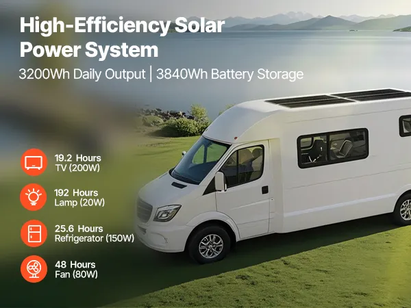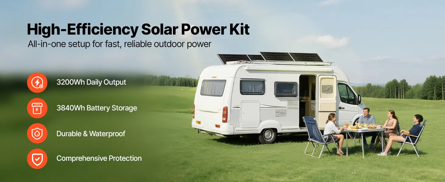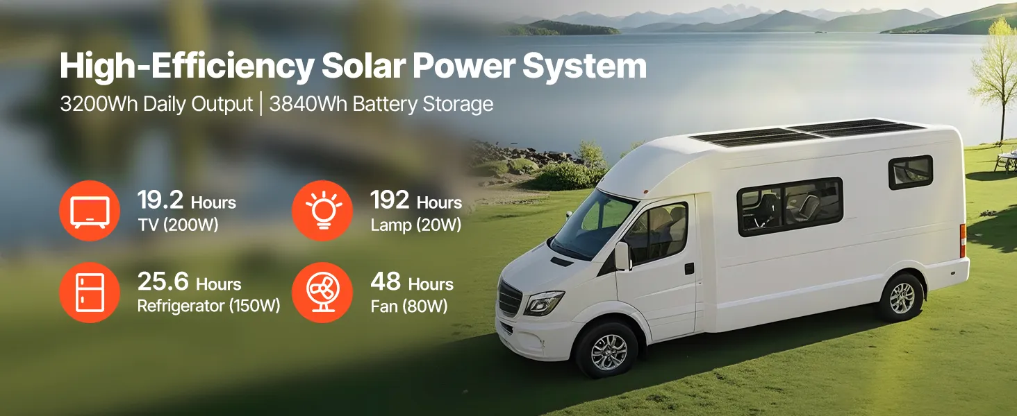 This solar power kit includes 4pcs 200W monocrystalline solar panels, a 12.8V 300Ah LiFePO₄ battery, 60A MPPT solar charge controller, and a 12V 2000W power inverter. With up to 3200Wh/day output and 3840Wh battery storage, it provides reliable power for boats, cabins, homes, farms and more.