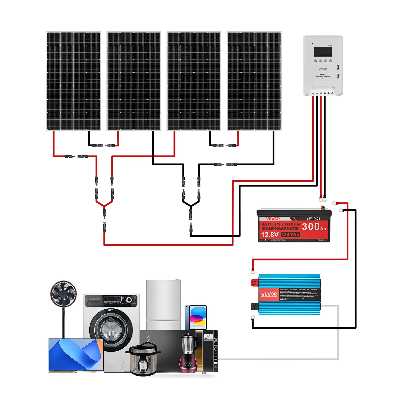 VEVOR 800W 12V Complete Solar Power Kit, 4*200W Monocrystalline Solar Panels + 12.8V 300Ah LiFePO₄ Battery + 60A MPPT Charge Controller + 2000W Power Inverter for Home, Small Farm, Cabin, Off-Grid