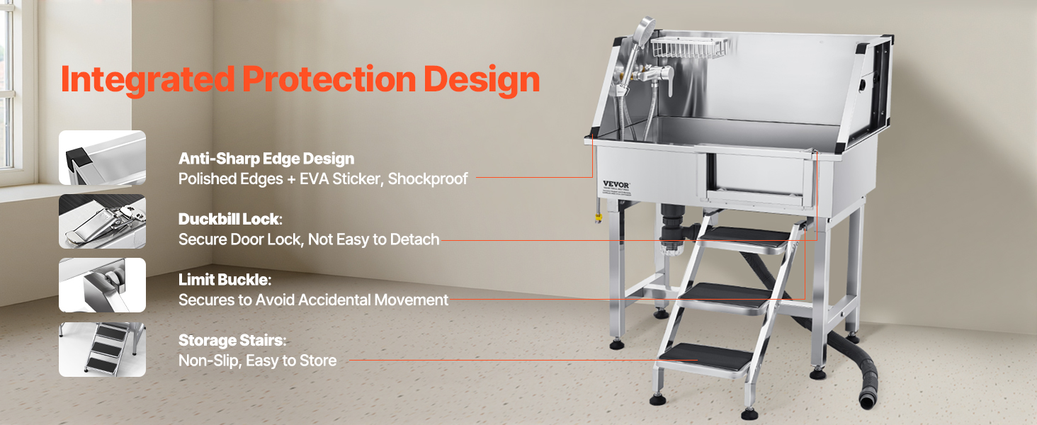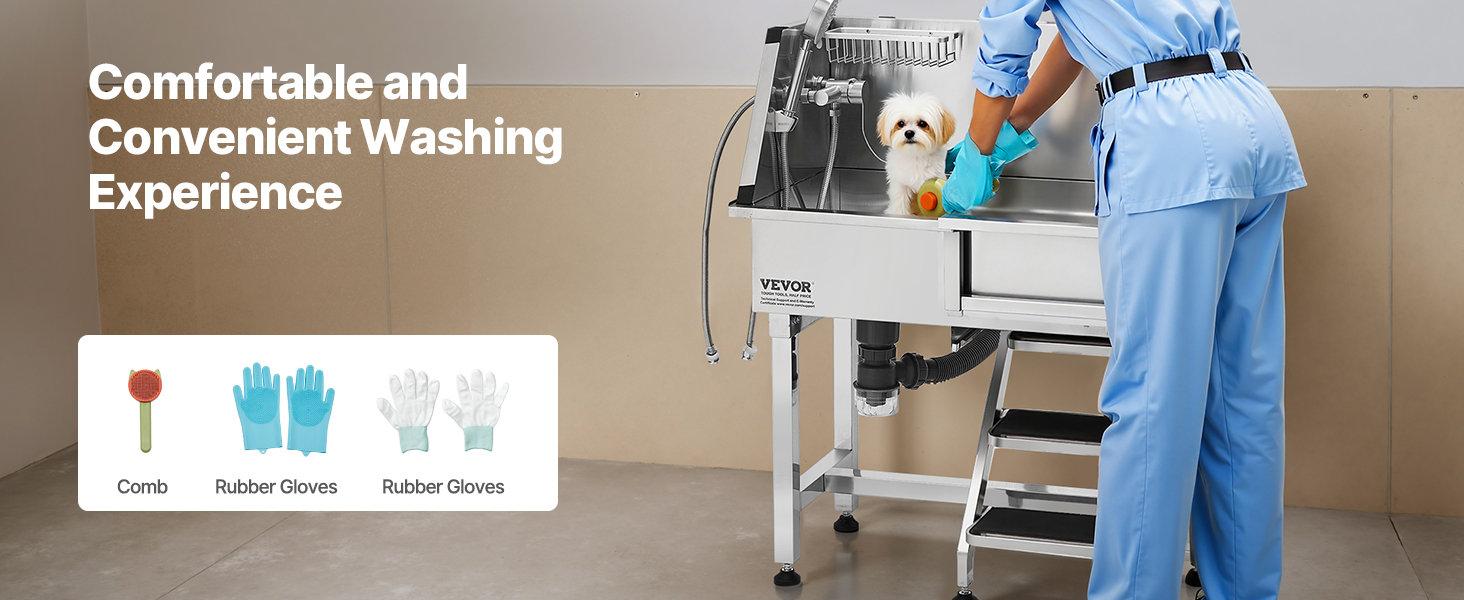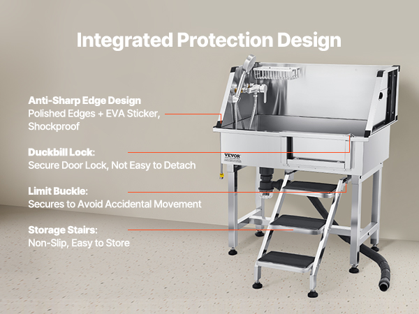 This tub ensures no water leakage. Made from stainless steel, it is corrosion-resistant and sturdy, maintaining its new look over time. The tub features smooth edges, ensuring security for both pets and users during bathing.
