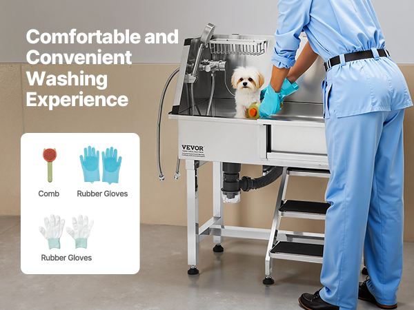 VEVOR 86.4 cm Stainless Steel Dog Washing Station, Pet Grooming Tub with Hot & Cold Faucet, Showerhead, Home Wash Sink, Fits Small Cats and Dogs, Non-Slip Stairs (Right Door)