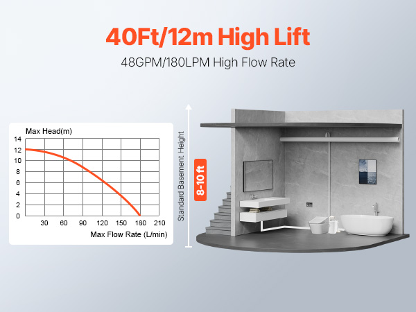 Featuring 48 GPM/180 LPM drainage and 40 ft/12 m lift, this sewage disposal pump reliably processes wastewater from basements or upper floors.