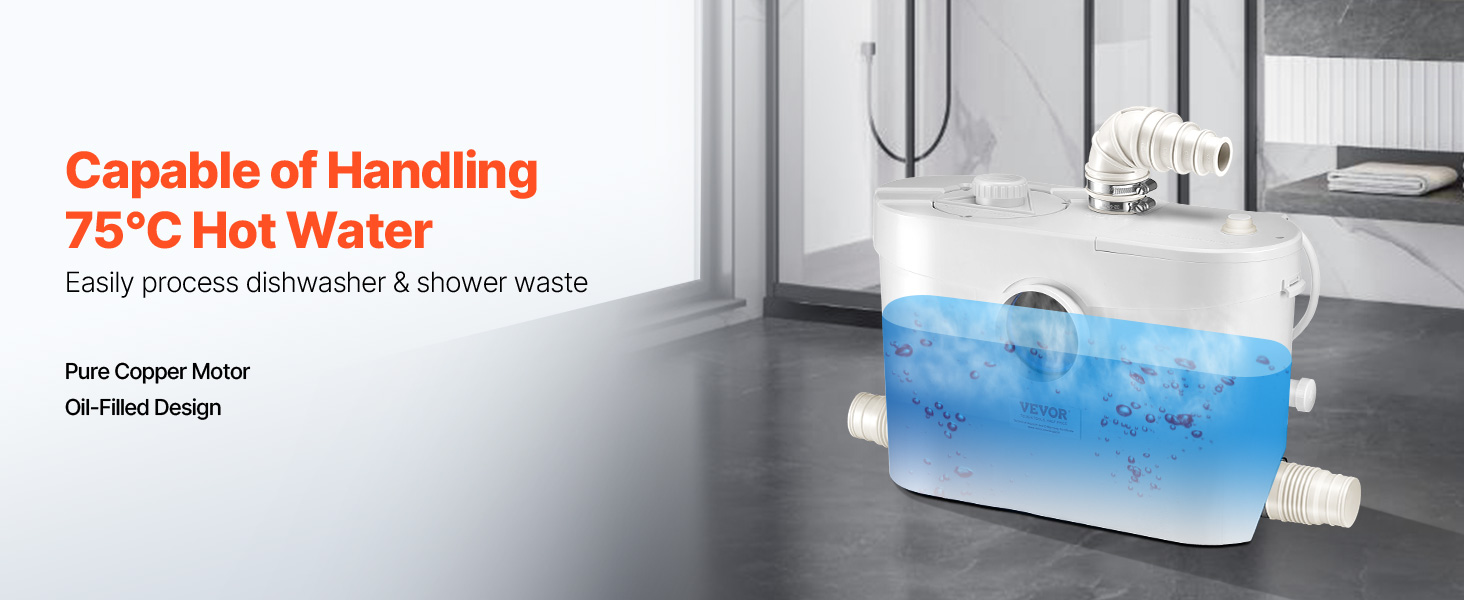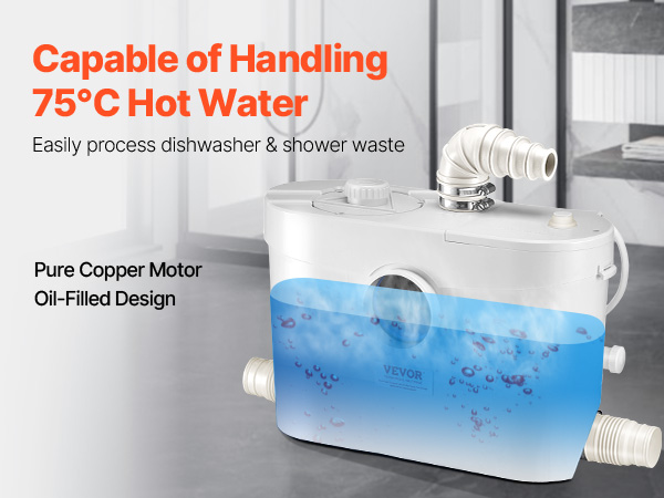 Equipped with a copper motor and oil-filled design, this macerator sewerage pump manages wastewater up to 75℃/167℉ from dishwashers and washing machines with ease.