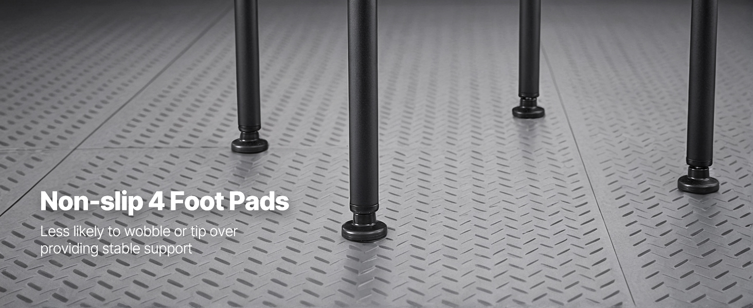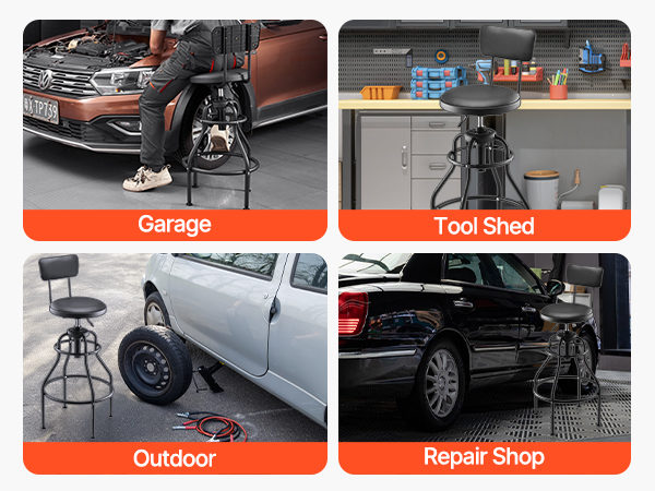 Our garage repair seat features a heavy-duty steel frame and reinforced screws with a 300lbs weight capacity. It offers stability, comfort, and the right height, allowing you to work without bending or kneeling for long periods.