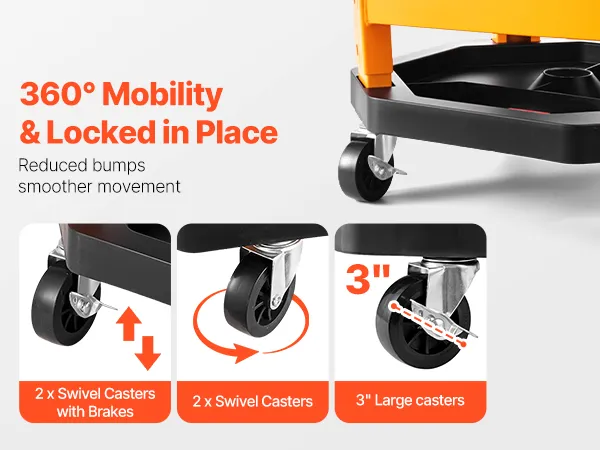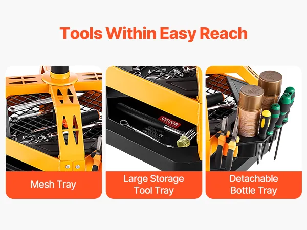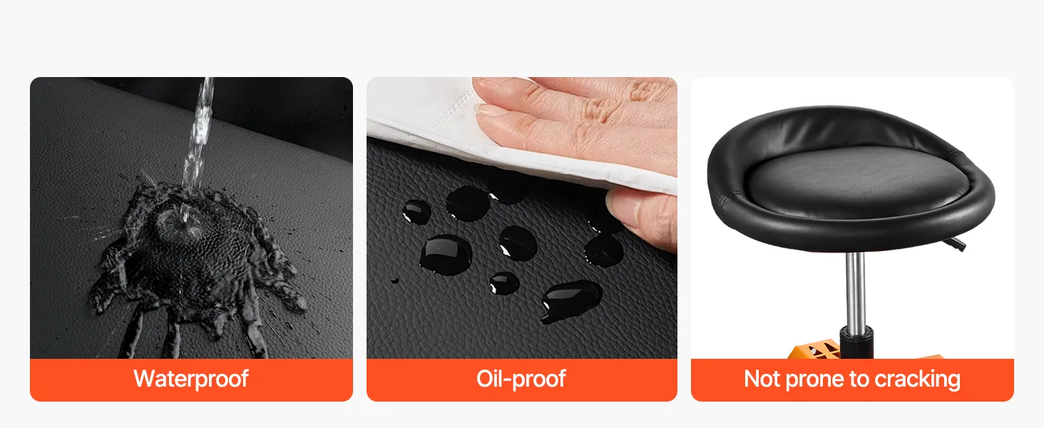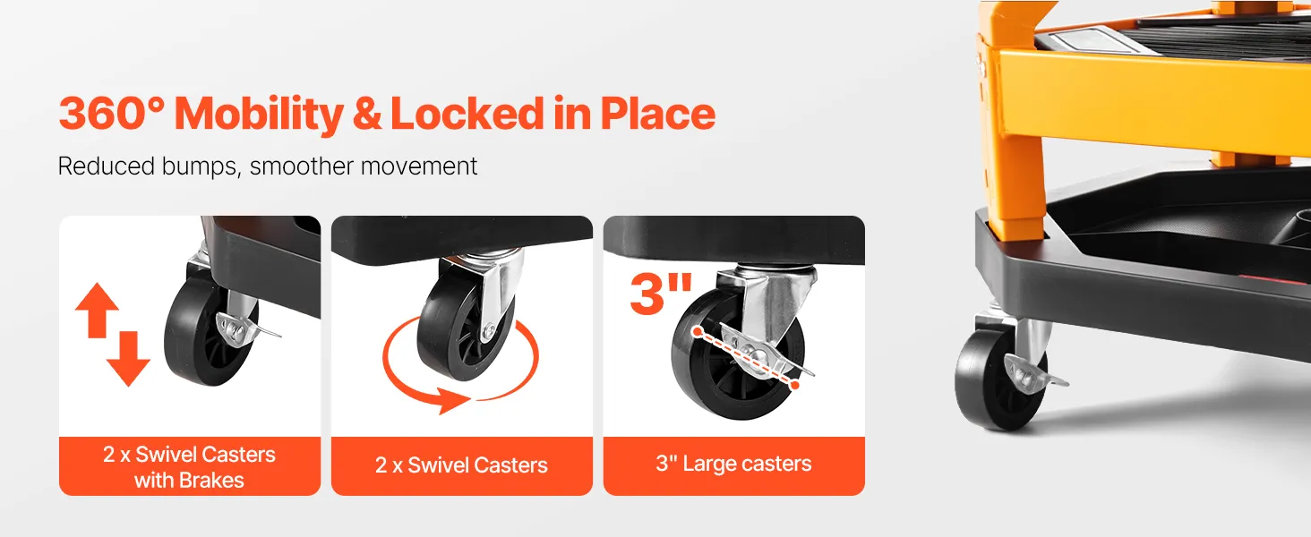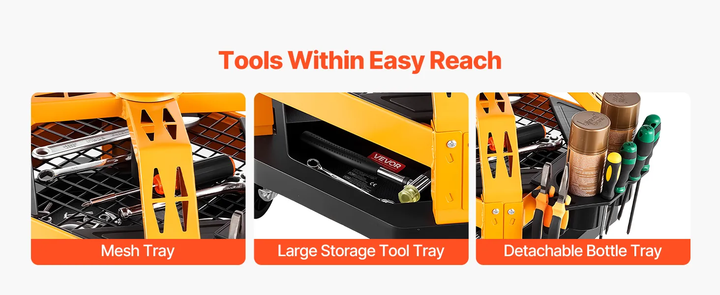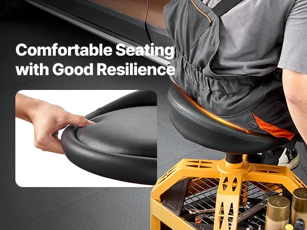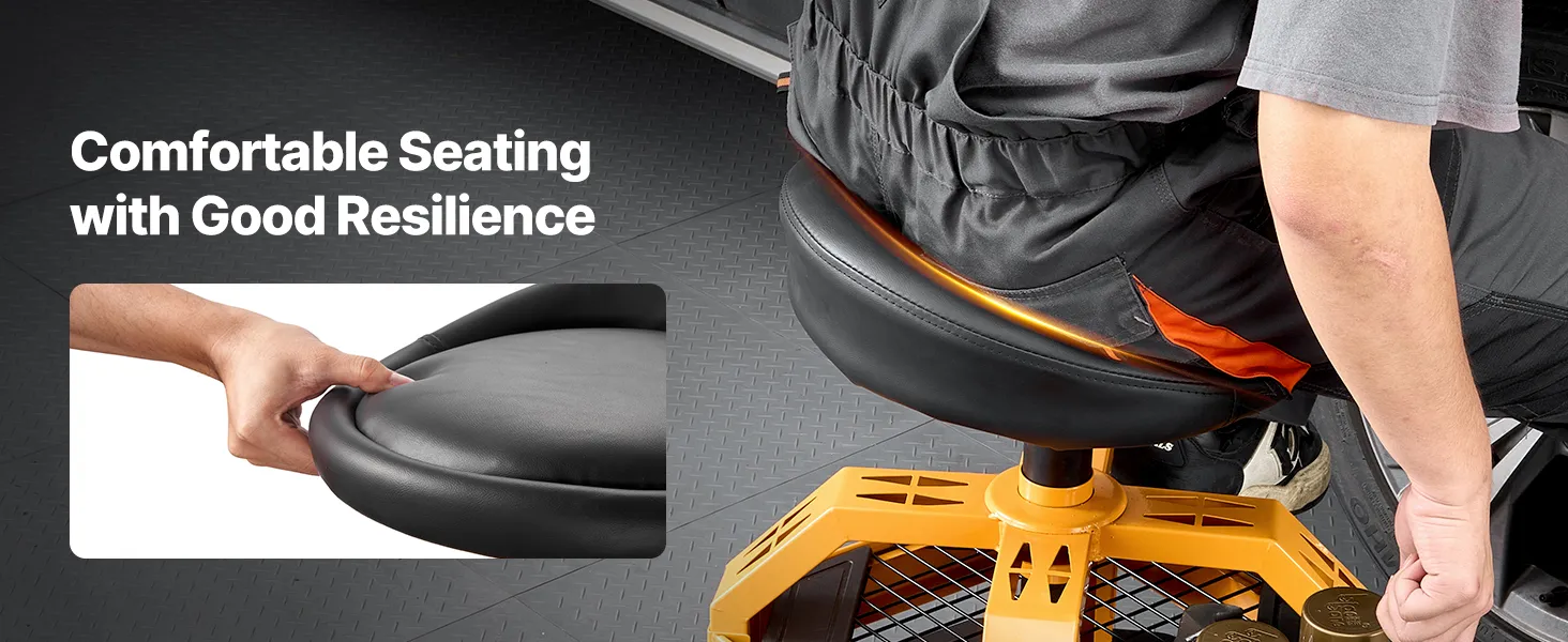 Our garage repair seat features a heavy-duty steel frame and reinforced screws with a 300lbs weight capacity. It offers stability, comfort, and the right height, allowing you to work without bending or kneeling for long periods.