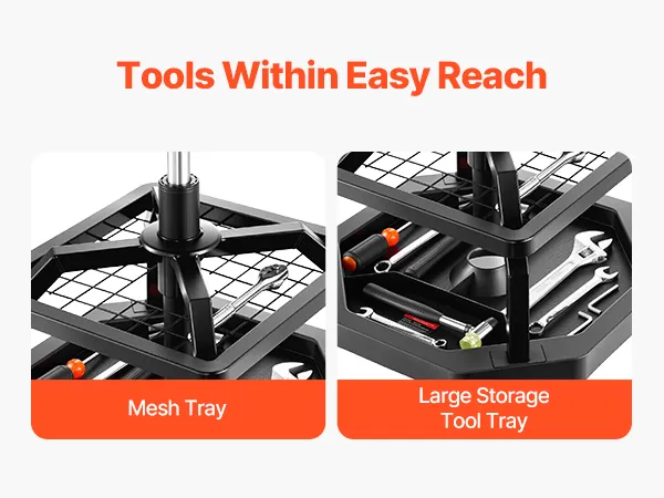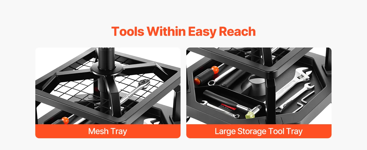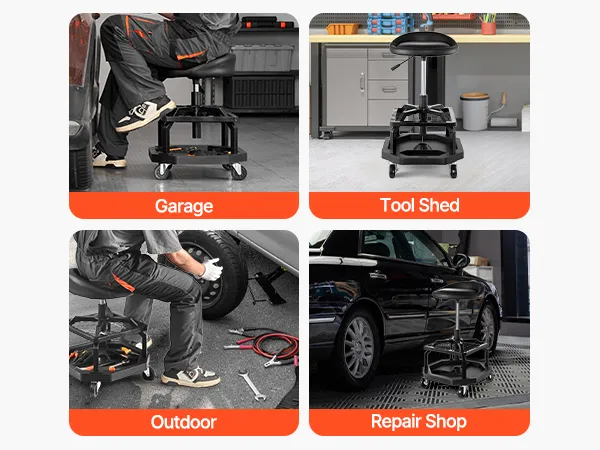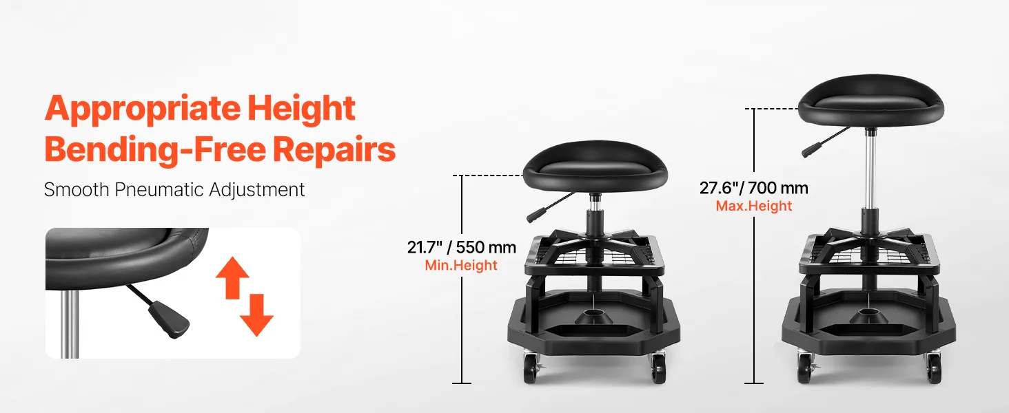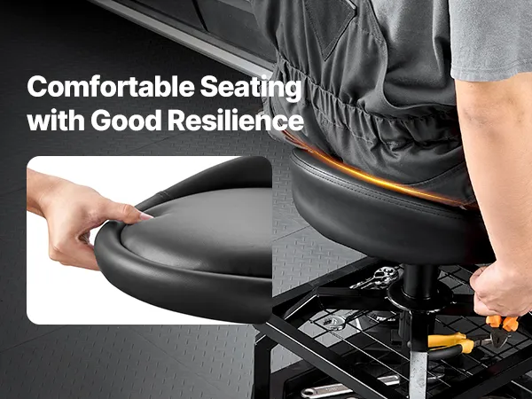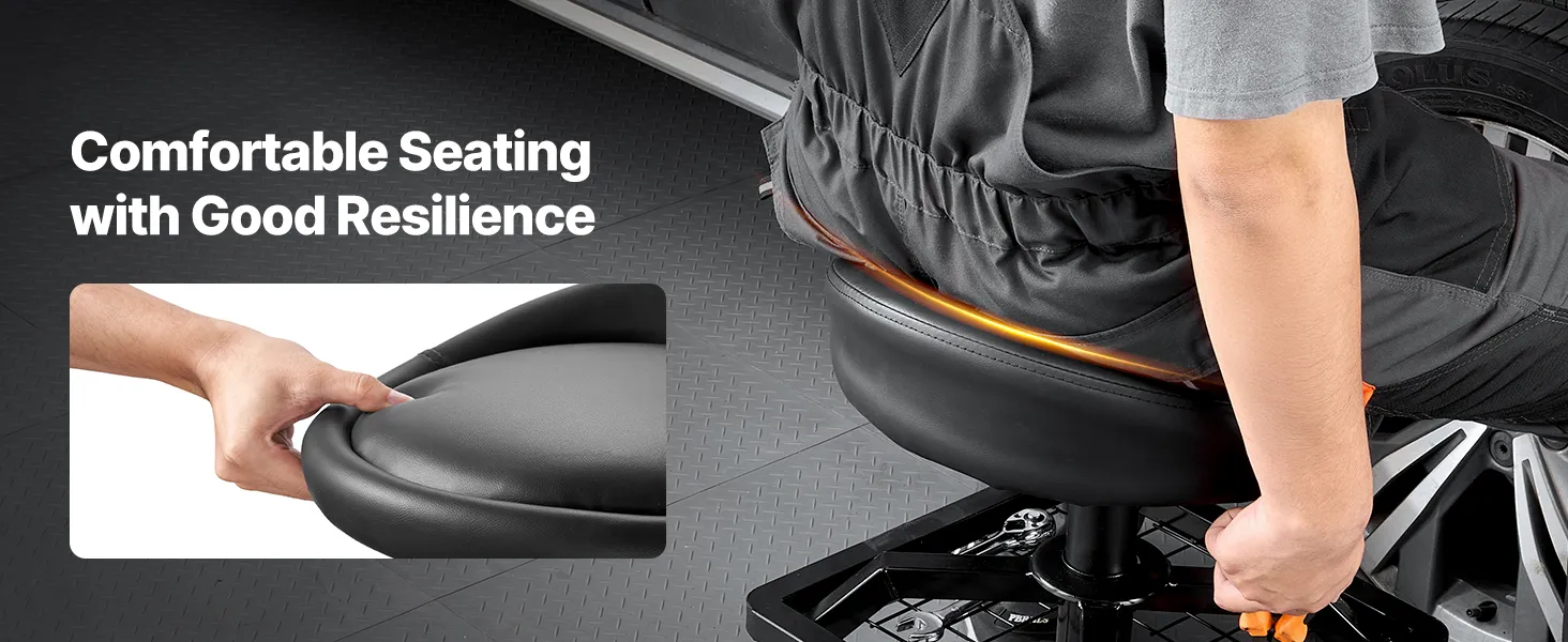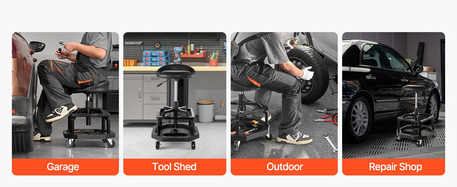 Our garage repair seat features a heavy-duty steel frame and reinforced screws with a 300lbs weight capacity. It offers stability, comfort, and the right height, allowing you to work without bending or kneeling for long periods.