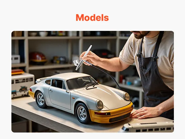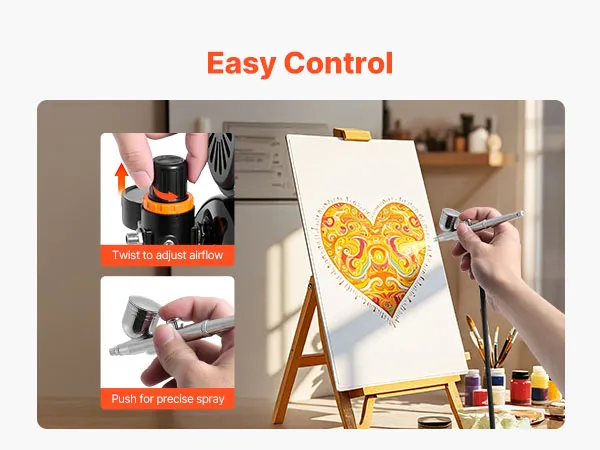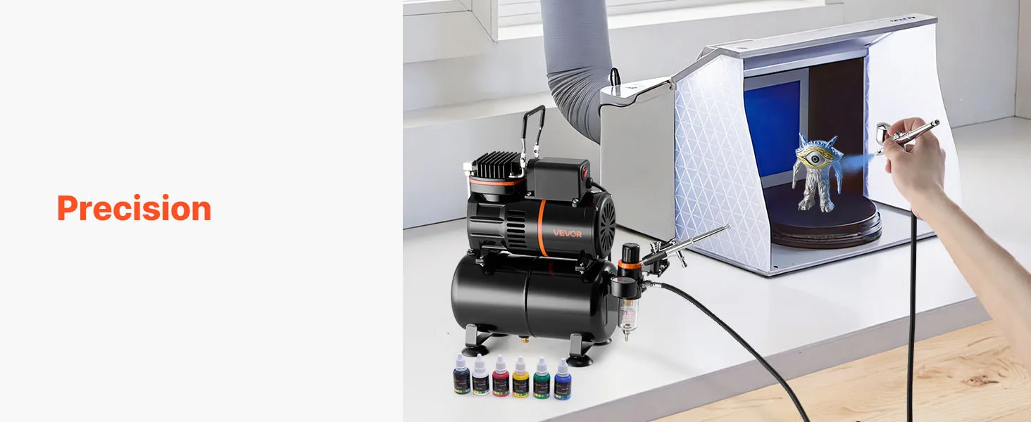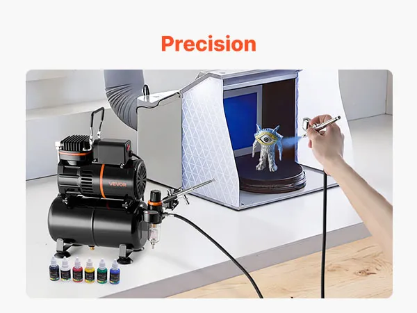 Our airbrush kit includes a compressor, an air tank, 3 airbrushes, 6 acrylic paints, a thinner, a cleaner, a cleaning brush, a hose, a holder and a color wheel card. No extra purchases needed—ideal for beginners and pros alike.