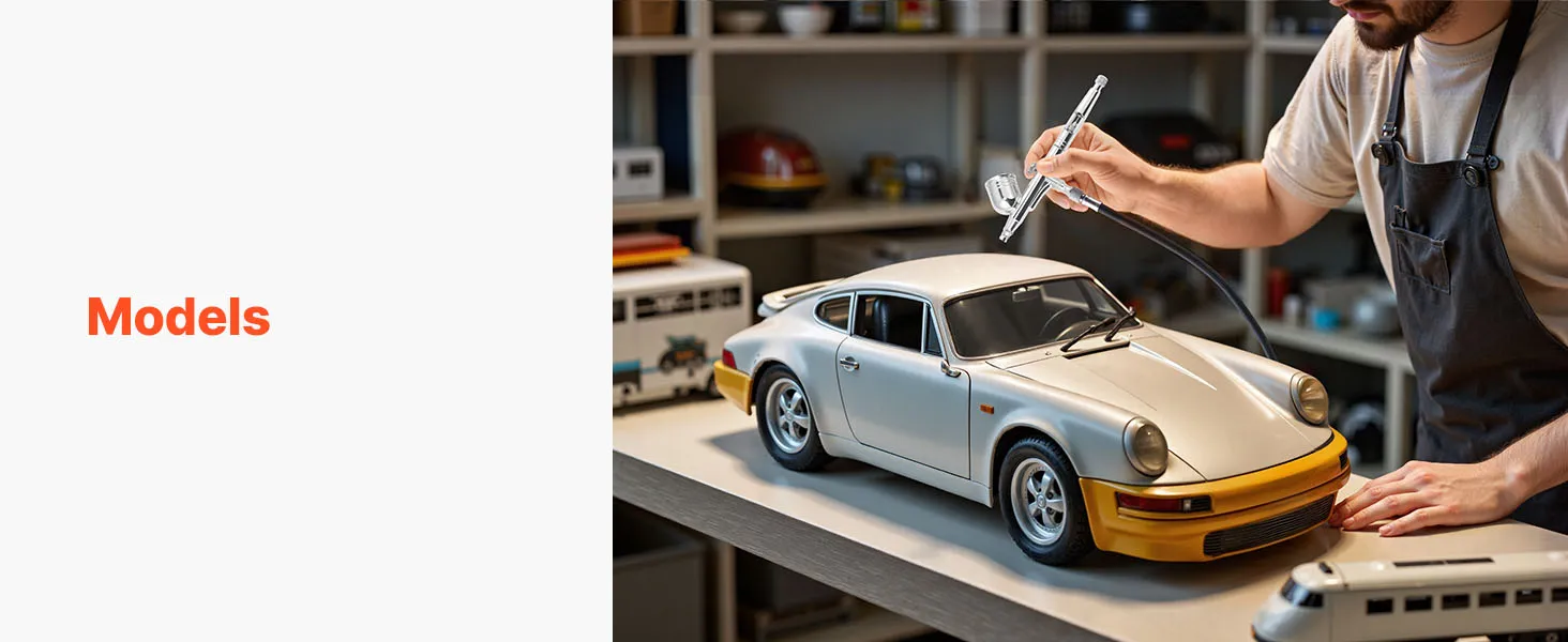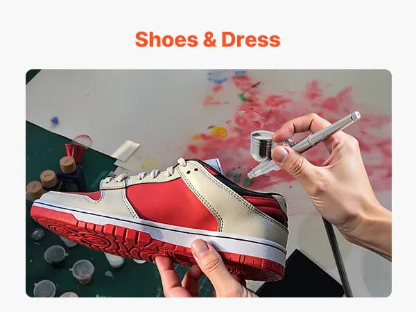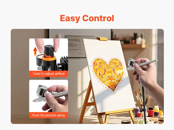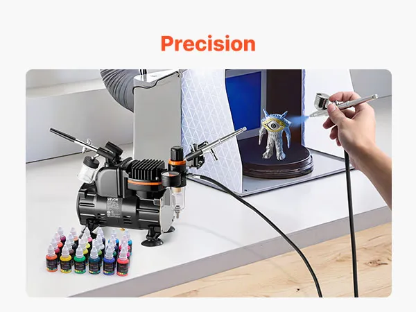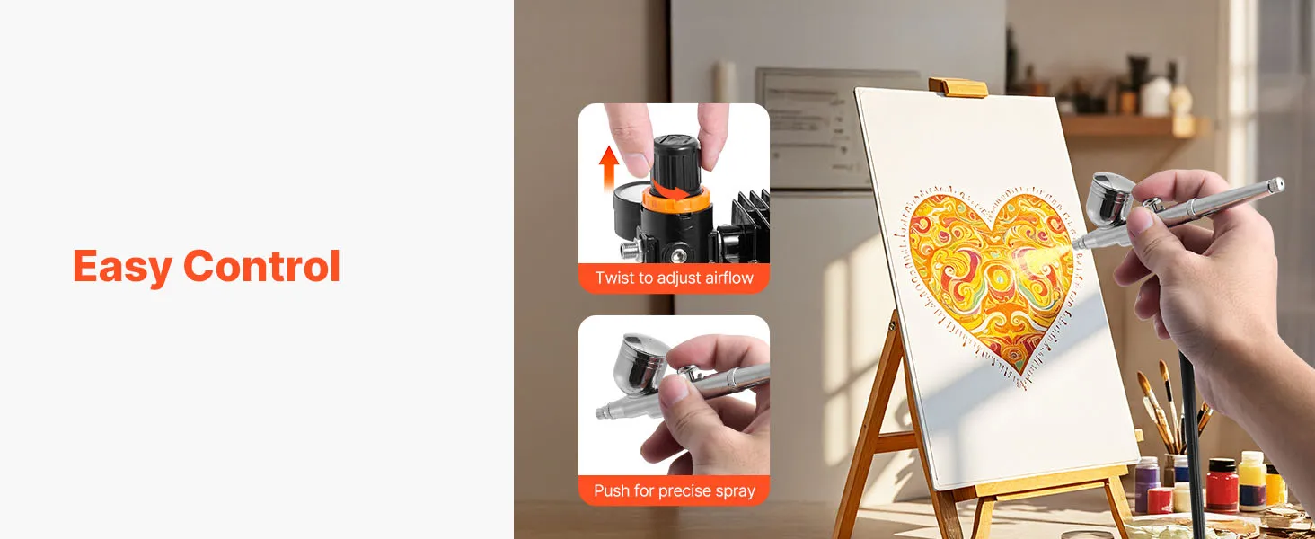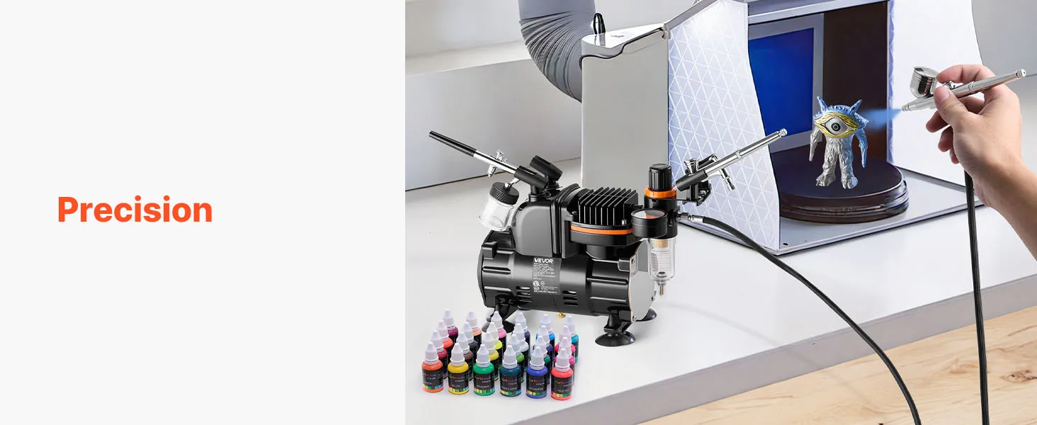 Our airbrush kit includes a compressor, 3 airbrushes, 24 acrylic paints, 5 siphon cups, 2 cleaning brushes, a cleaning bottle, a hose, a holder and a color wheel card. No extra purchases needed—ideal for beginners and pros alike.