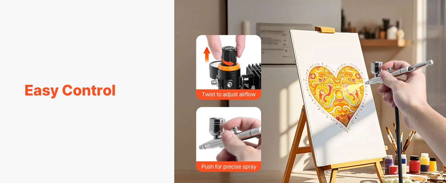 Our airbrush kit includes a compressor, a dual-action airbrush, 3 nozzles (0.2 mm, 0.3 mm, 0.5 mm), a cleaning kit, a hose, and a holder. No extra purchases needed—ideal for beginners and pros alike.