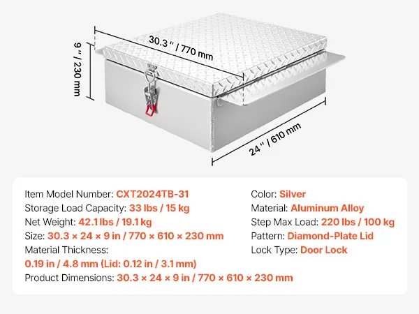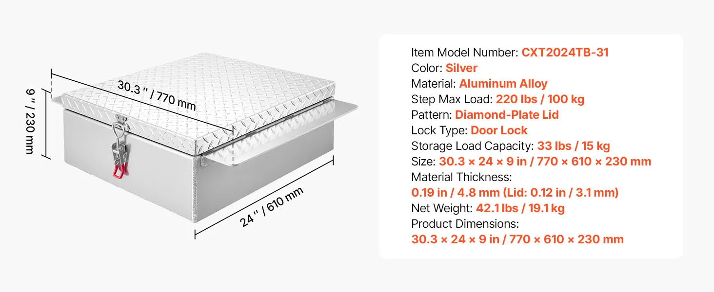 This truck tool box features a full aluminum frame with 3.82 cu ft (≈108 L) of storage space and a step platform supporting up to 220 lbs / 100 kg. Mounted on the side of your truck, it allows quick and easy access to tools and items without entering the cab.
