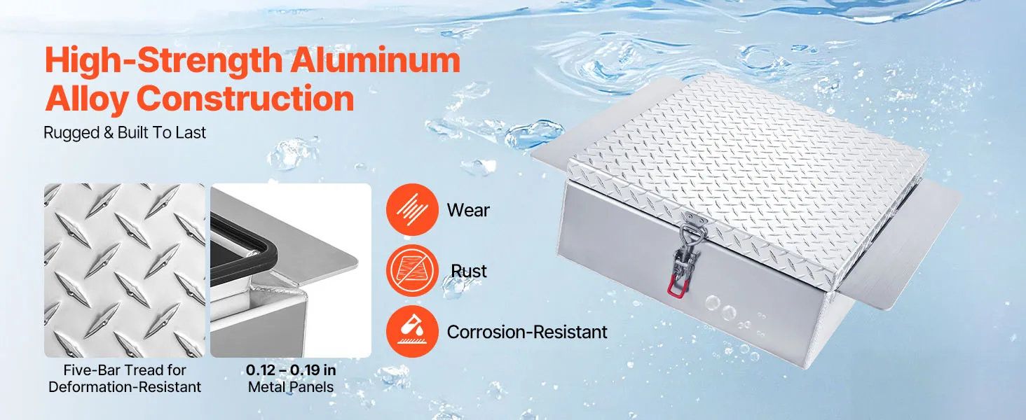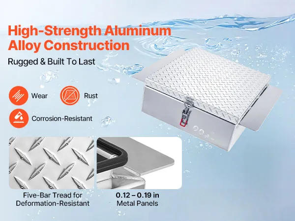 Constructed from 0.12-0.19 in / 3.1 mm-4.8 mm thick reinforced metal panels and a high-strength aluminum alloy frame with diamond tread, this truck toolbox provides excellent wear-, rust-, and corrosion-resistance, ensuring long-lasting use.