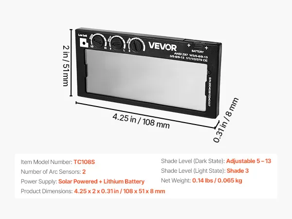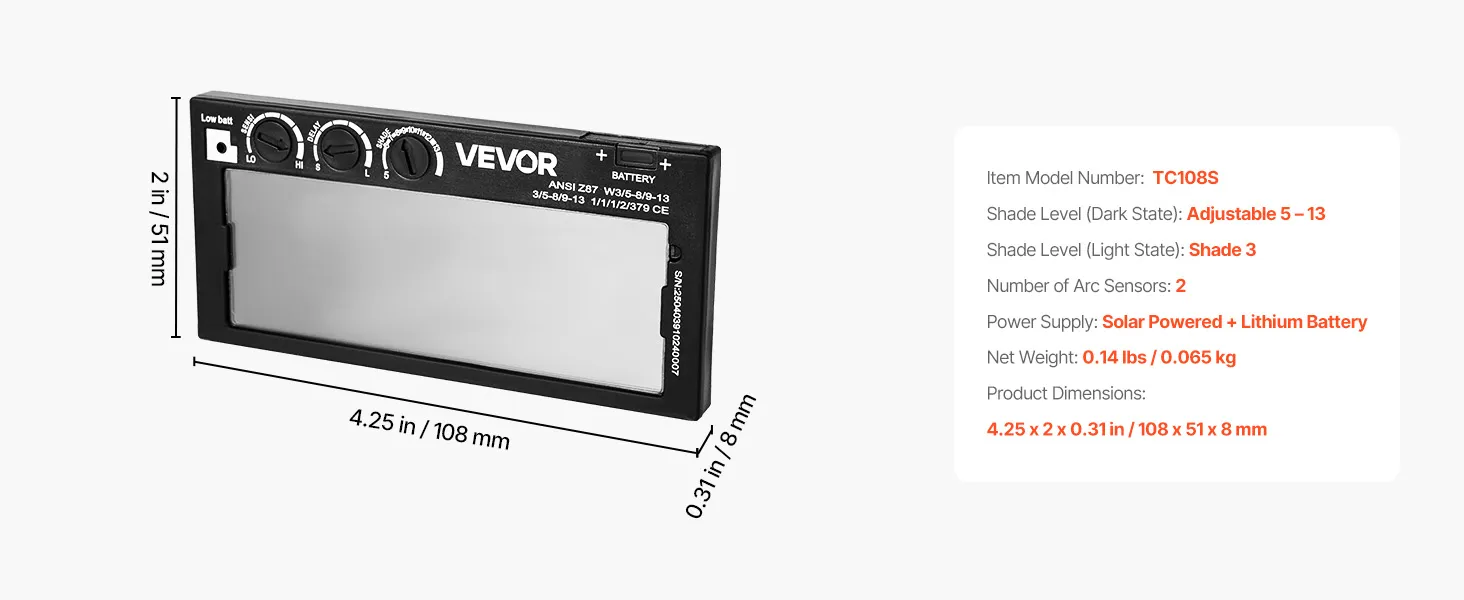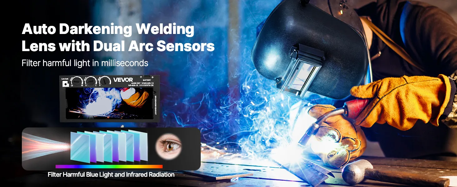 VEVOR Auto Darkening Welding Lens 108 x 51 mm, Shade 5-13 Adjustable True Color Welding Lens with Dual Arc Sensors, Compatible with Most Welding Helmets for TIG, MIG, MMA Applications