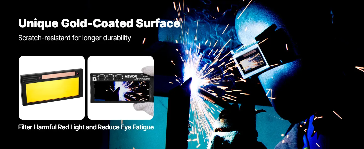 Our auto-darkening welding lens features an upgraded gold-coated design for longer durability. It also offers 3 adjustable settings — shade level, delay time, and sensitivity — providing precise control to meet the needs of various welding tasks.