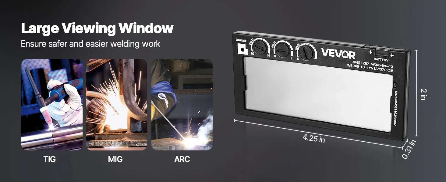 Equipped with a 4.25" x 2" (108 x 51 mm) large viewing window for a wider, clearer field of vision during welding. Ideal for TIG, MIG, or ARC, enjoy better visibility and enhanced operational safety.