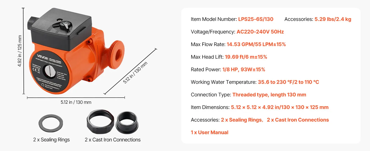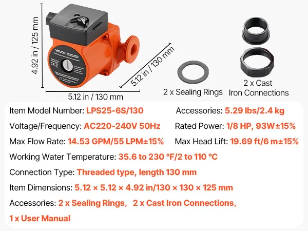 VEVOR LPS25-6S/130 Cast Iron Circulator Pump, 1/8 HP, 220-240V 55 LPM Hot Water Recirculating Circulation Pump, Threaded Connection, 3-Speed Adjustment, Quiet Operation, for Home Heating System